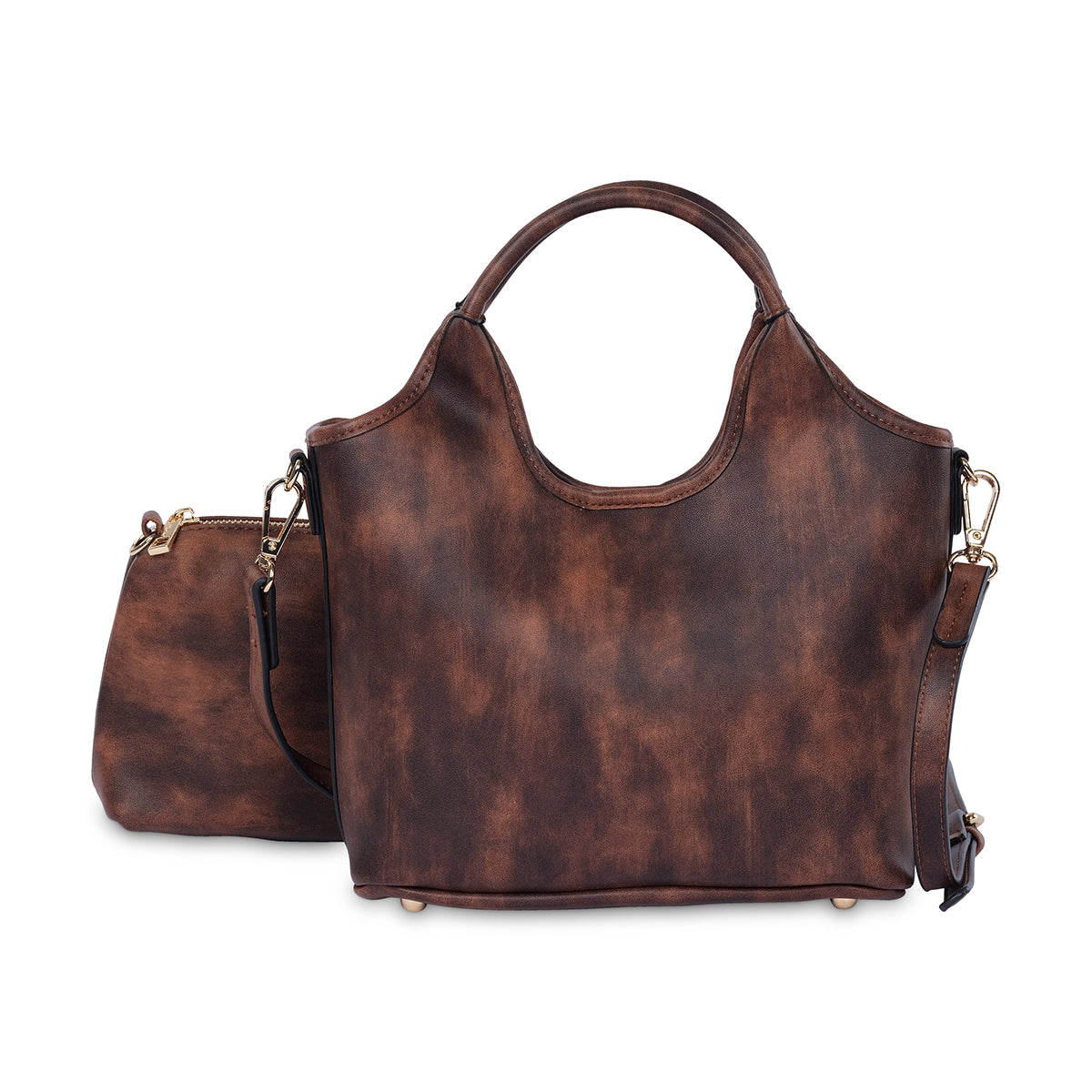 A perfect blend of style and practicality, the 'Carey Mini' woven tote is a versatile choice for any season. Its rich brown texture and sculptural top handles create a chic, elevated look. This bag comes with a matching clutch, making it a perfect two-in-one accessory for effortlessly transitioning from day to night.