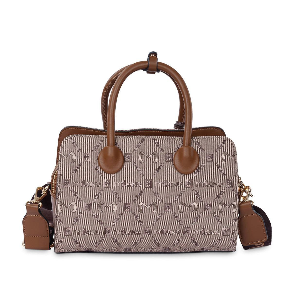 Meet the 'Cotie', a satchel that effortlessly blends classic elegance with a modern edge. This bag is crafted from a durable material with an all-over monogram pattern, accented by rich brown trim and polished hardware. A collection of decorative charms adds a unique and fashionable flair, while two zippered compartments and a logo-print strap provide both style and functionality.