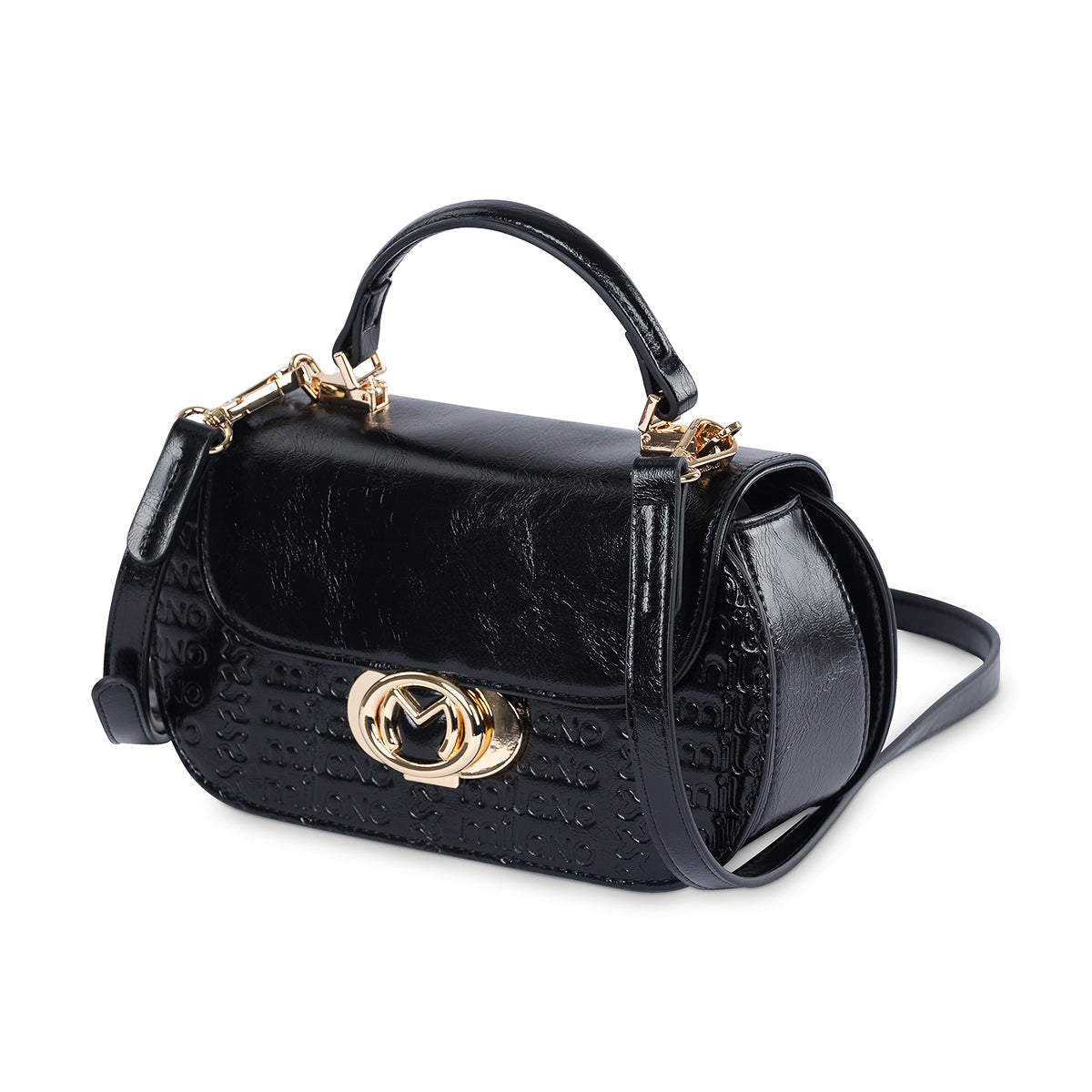 A classic accessory with a modern twist, the 'Hamesha' handbag is designed to make a statement. This sleek, black bag features a structured top handle and a bold gold-tone clasp with a distinctive logo. The side panels are embossed with a repeating pattern, adding a subtle touch of brand identity to its timeless design.