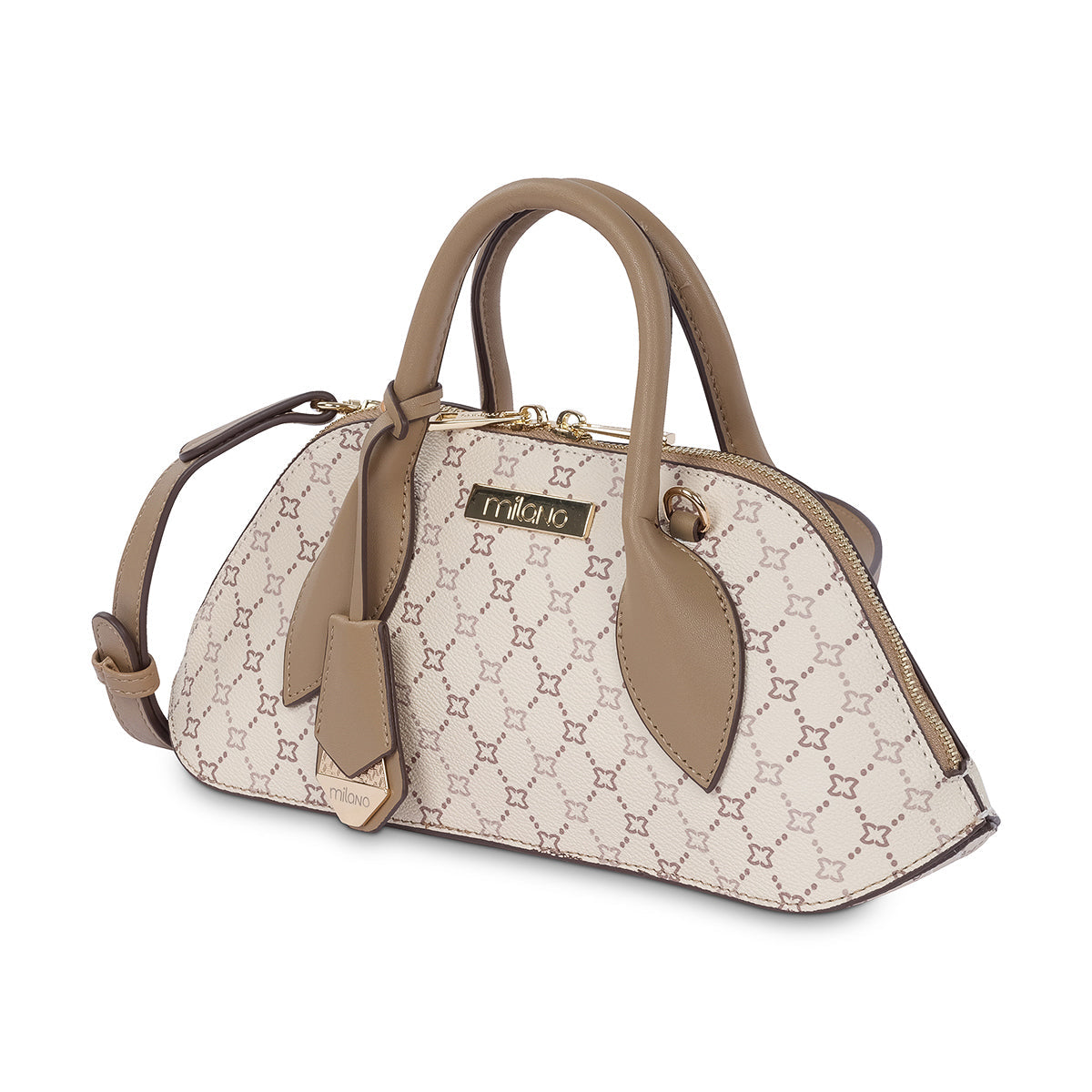 Add a touch of timeless sophistication to your look with the 'Penny' bowling bag. This bag features a chic monogram pattern in a neutral color palette, complemented by classic top handles and polished gold-tone hardware. The structured silhouette and spacious interior make it the perfect accessory for both daily use and weekend getaways.