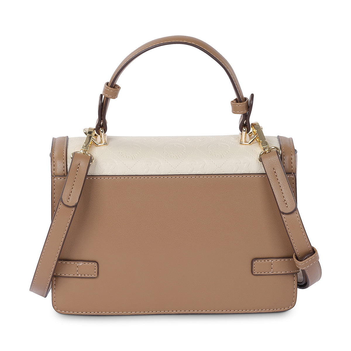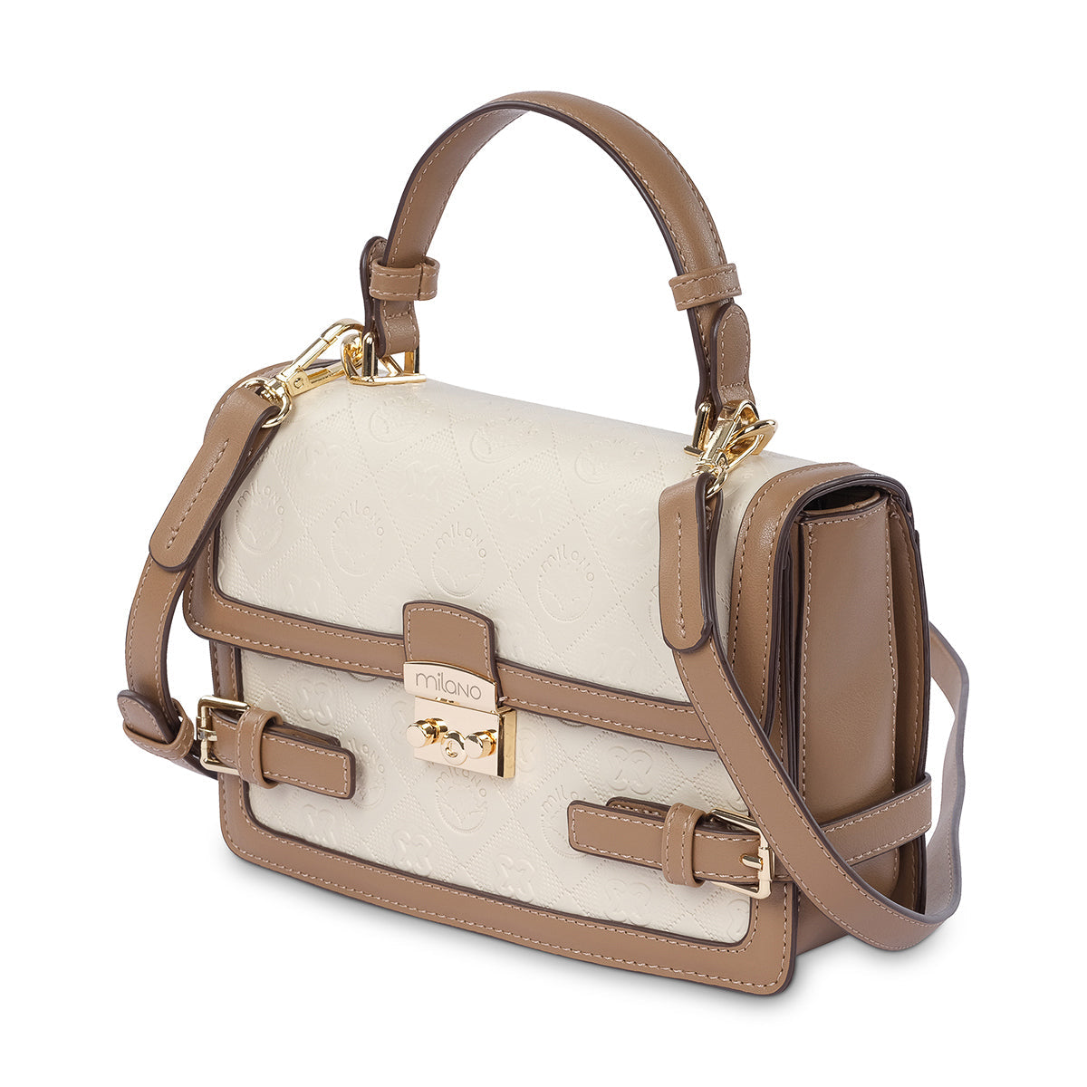 Elevate your look with the 'Milano' structured bag, a piece that blends classic sophistication with modern flair. The bag is crafted in beige with a subtle, embossed all-over pattern and features a top handle with a detachable strap for versatile styling. A stylish strap detail with gold-tone hardware adds a final touch of luxury, making it an essential piece for any occasion.