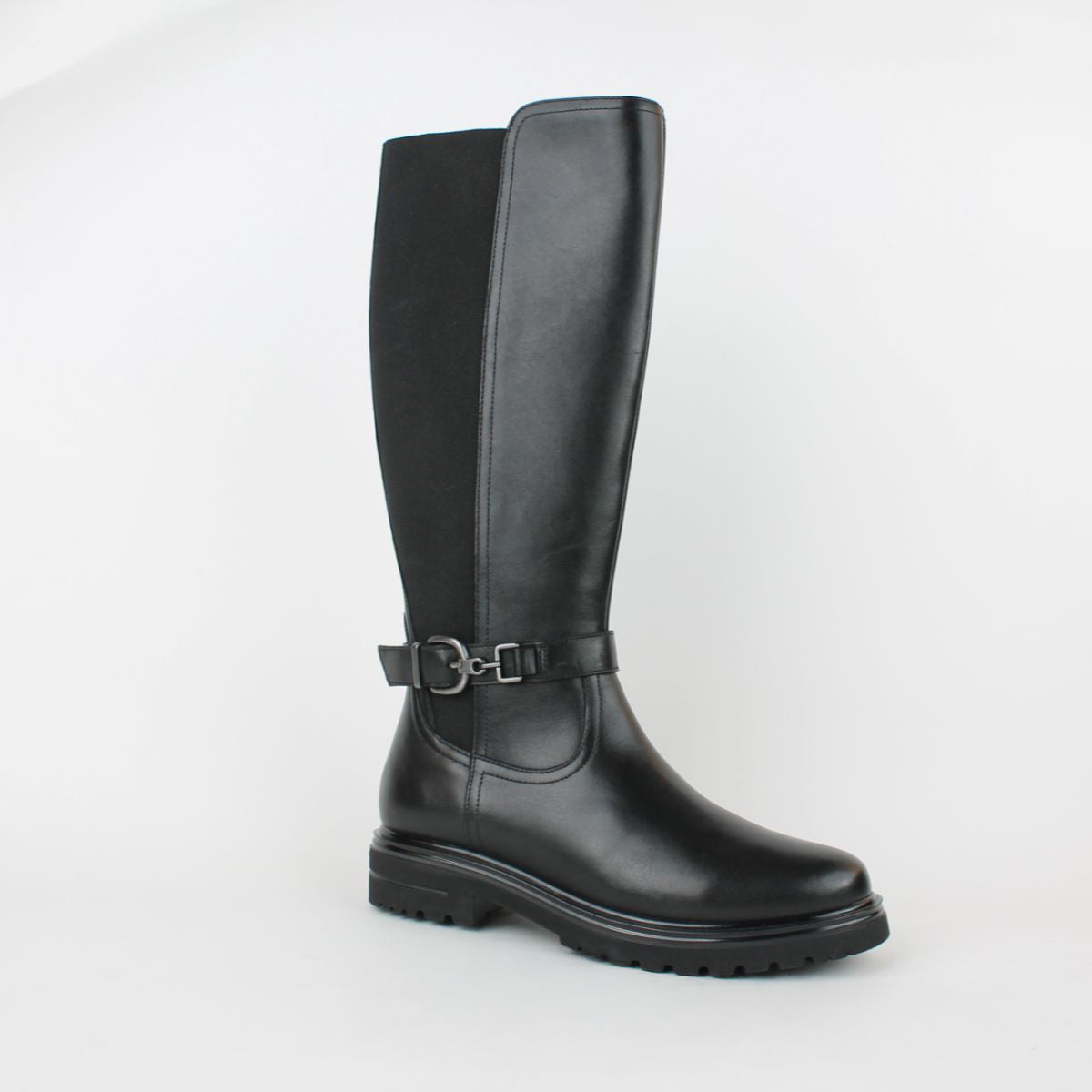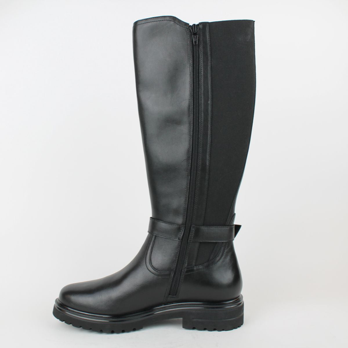 Classic Leather Riding Boot. Crafted with a premium leather upper, this boot features a polished silhouette that extends to the knee. Designed for both style and comfort, it includes a sophisticated decorative strap with a metal buckle and a full-length elastic panel on the back for a perfect, flexible fit. The low, lugged sole ensures a comfortable and stable stride, making this boot a versatile and chic addition to your cold-weather wardrobe.