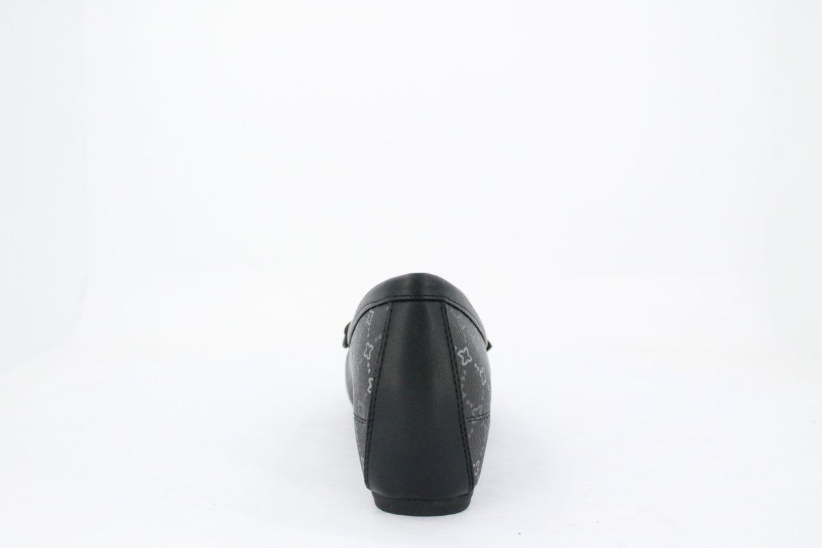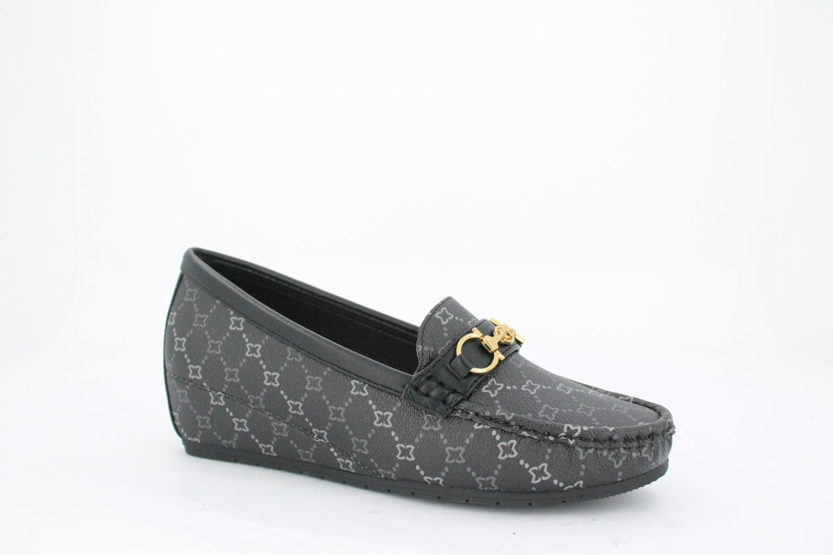 Step into sophisticated style with these ladies' slip-on moccasins. Featuring a new Milano monogram patterned upper in a dark gray hue. The low wedge heel ensures comfort, making them perfect for both casual and semi-formal occasions.