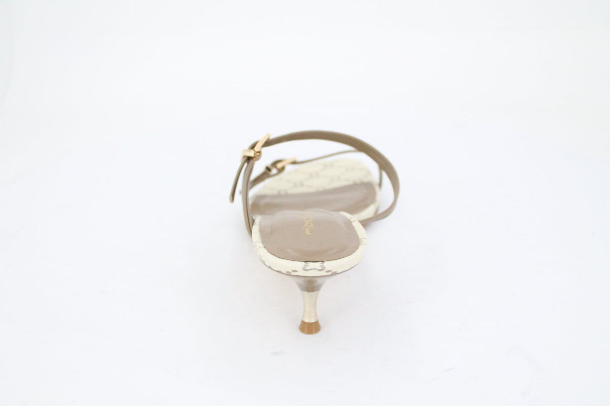 Elevate your look with the Shery Buckle Heel. Featuring dual gold-tone buckles, a signature Milano "MM' printed footbed, and a sleek kitten heel and gold tone sole. This sandal blends vintage charm with modern elegance.