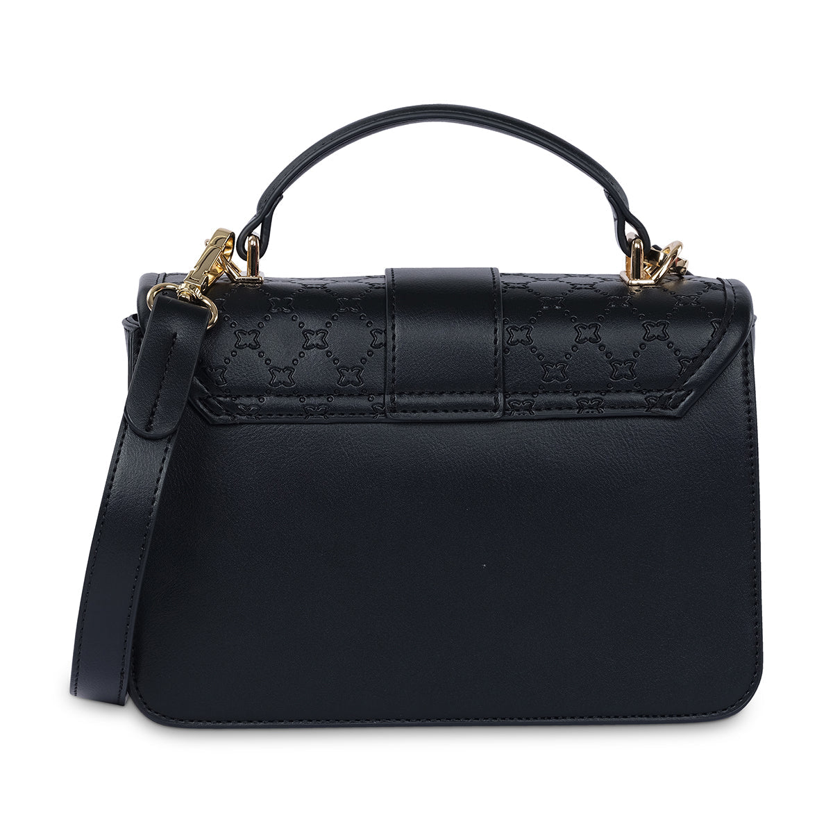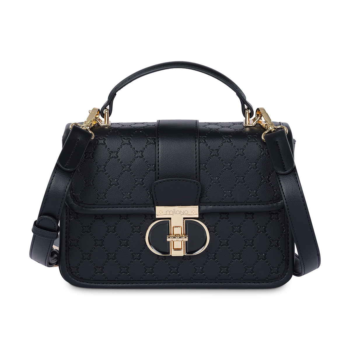 Embrace timeless elegance with the Ayaka, a classic flap bag designed to elevate your look. Crafted in sleek black with a sophisticated embossed pattern, this bag features a polished top handle and a detachable shoulder strap. Gleaming gold-tone hardware, including a distinctive turn-lock clasp, adds a luxurious finish, making it a perfect accessory for any occasion.