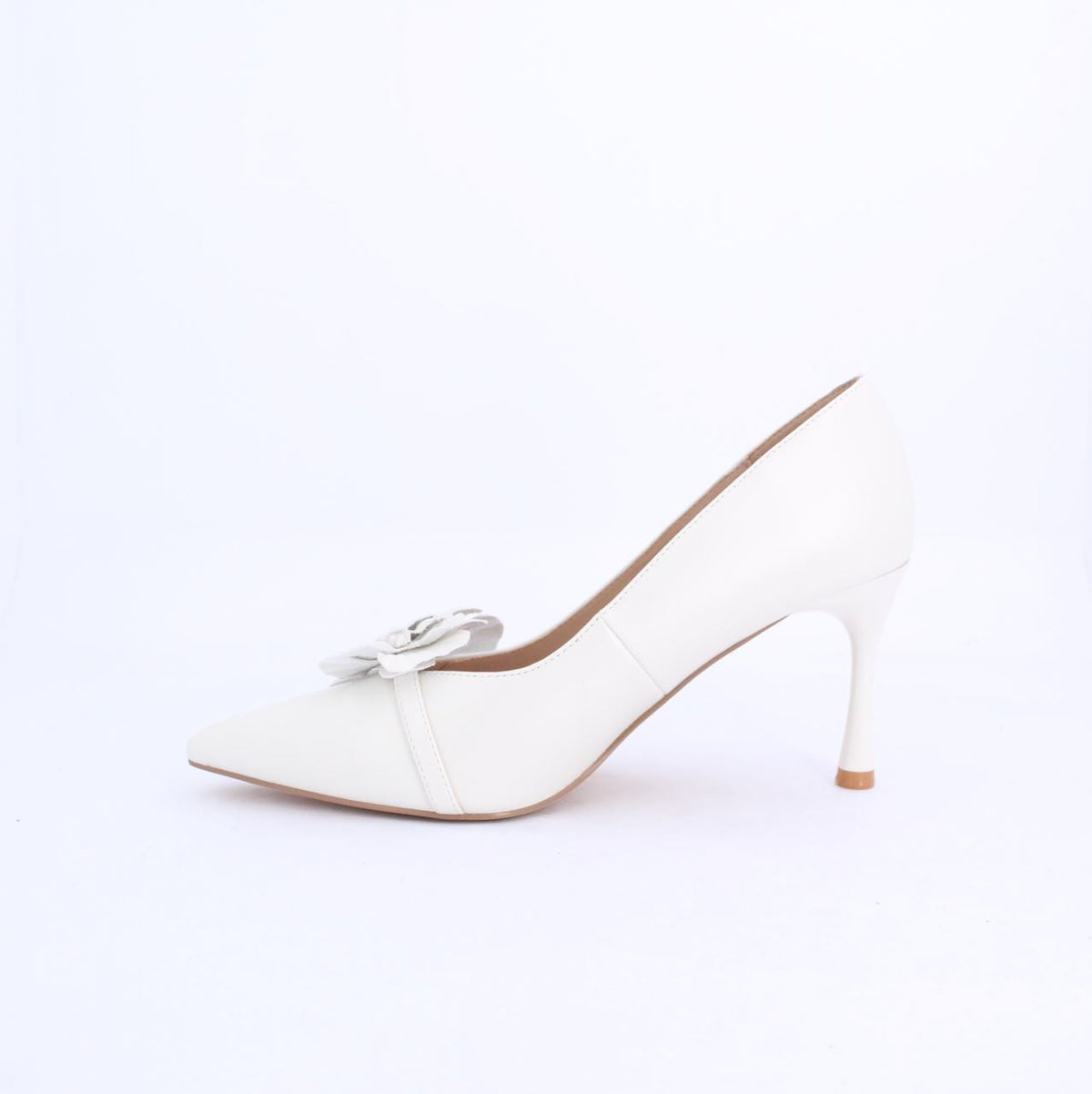 Caryll pump stiletto heel features a sleek pointed toe, a delicate floral embellishment for added elegance, and a cushioned insole for comfort. Its refined design makes it perfect for formal occasions, weddings, or evening events, combining sophistication and style while offering a secure and flattering fit.