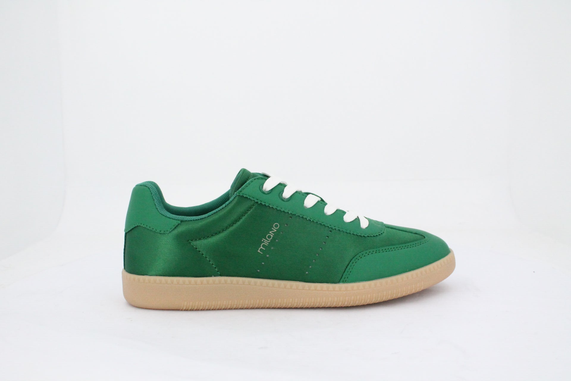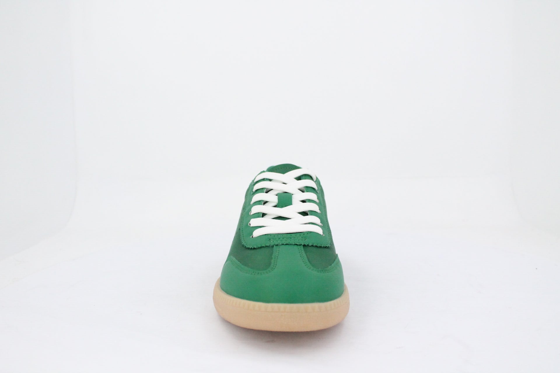 Vibrant green trainers, featuring a classic low-top design. The rich green upper is complemented by crisp white laces and a contrasting light tan sole, offering a fresh and versatile look. Perfect for adding a pop of color to any casual outfit, these sneakers combine comfort and contemporary flair.