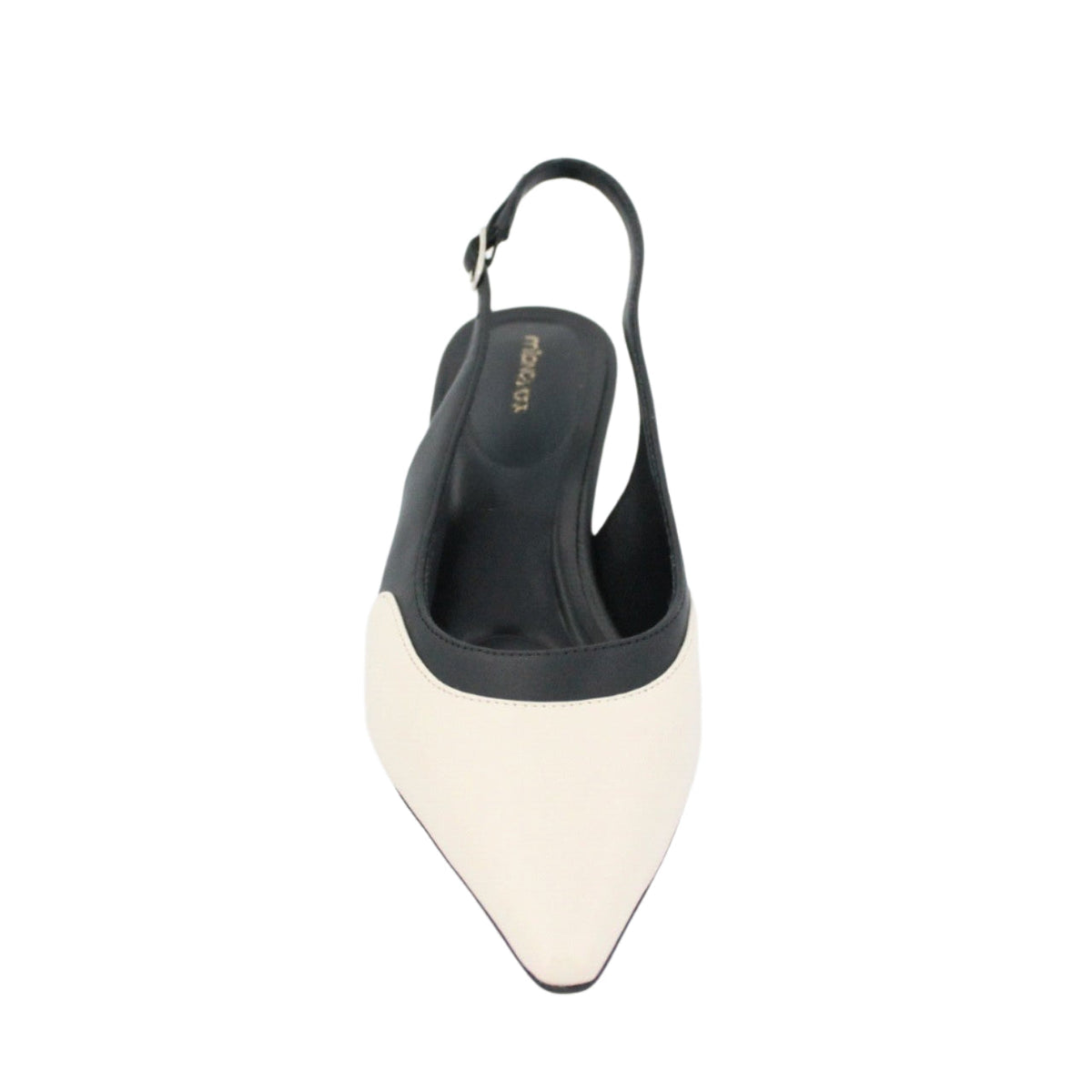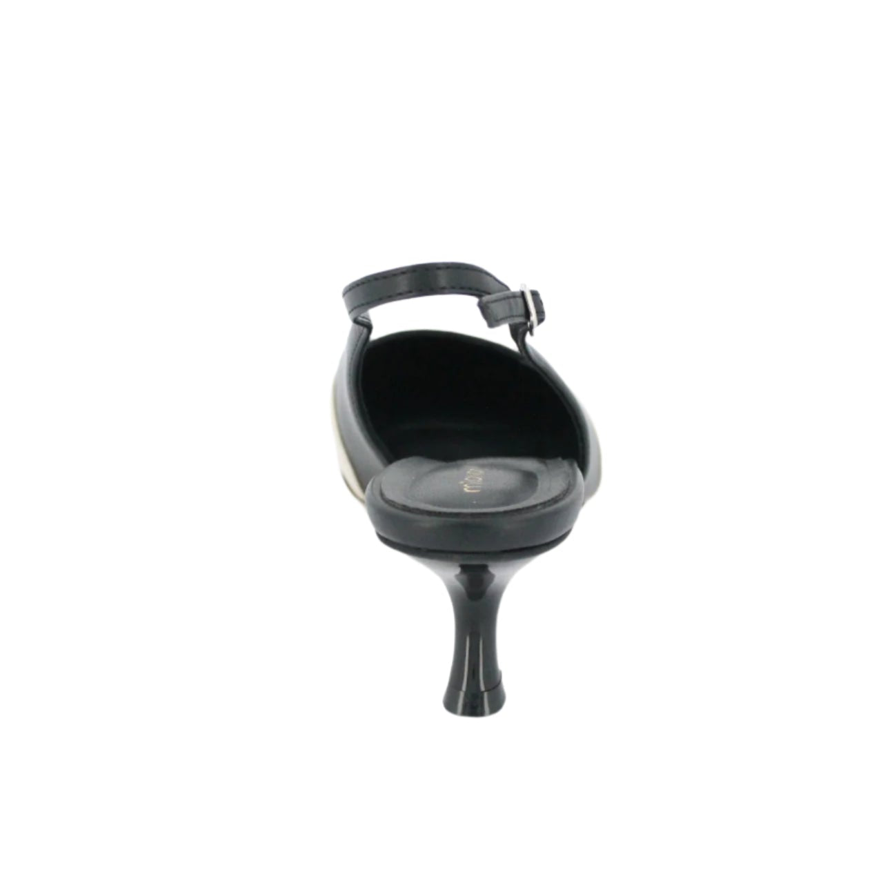 Make a bold statement with this modern black slingback. Featuring a unique sculpted silhouette, pointed toe, golden sole, and curved heel, it blends minimalism with edge. Adjustable strap and cushioned footbed ensure a secure comfortable fitƒ??It comes with a matching bag for a coordinated look-perfect for day-to-night wear.