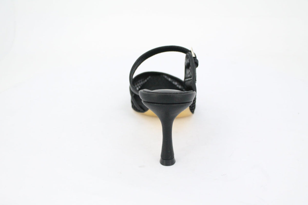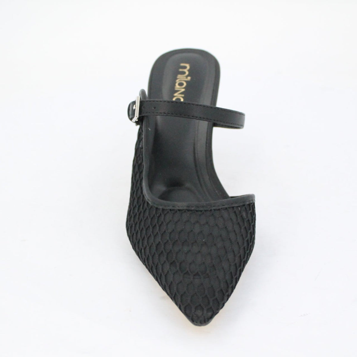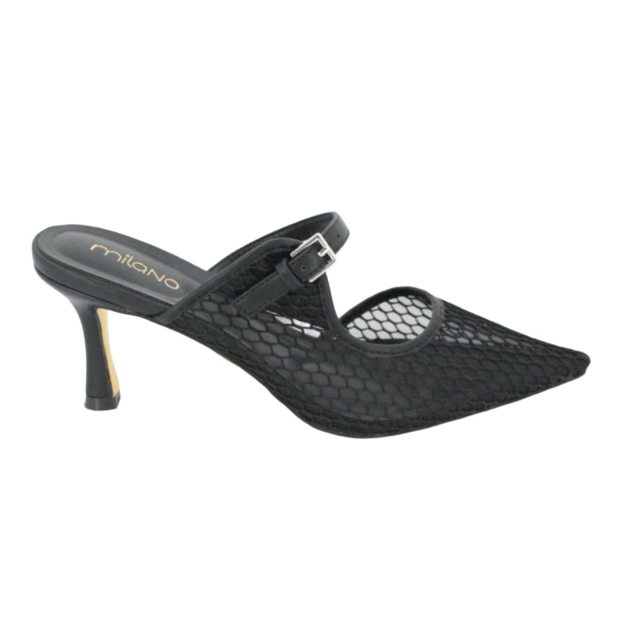Step into the night with these glamorous Satara heel mules. Their sharp pointed toe and towering stiletto heel, accented by a luxurious gold-finished sole, radiate modern sophistication. The breathable mesh offers a hint of intrigue, while the delicate ankle strap ensures you'll feel as secure as you look stylish. Make a statement at your next special event with these exquisitely refined mules.