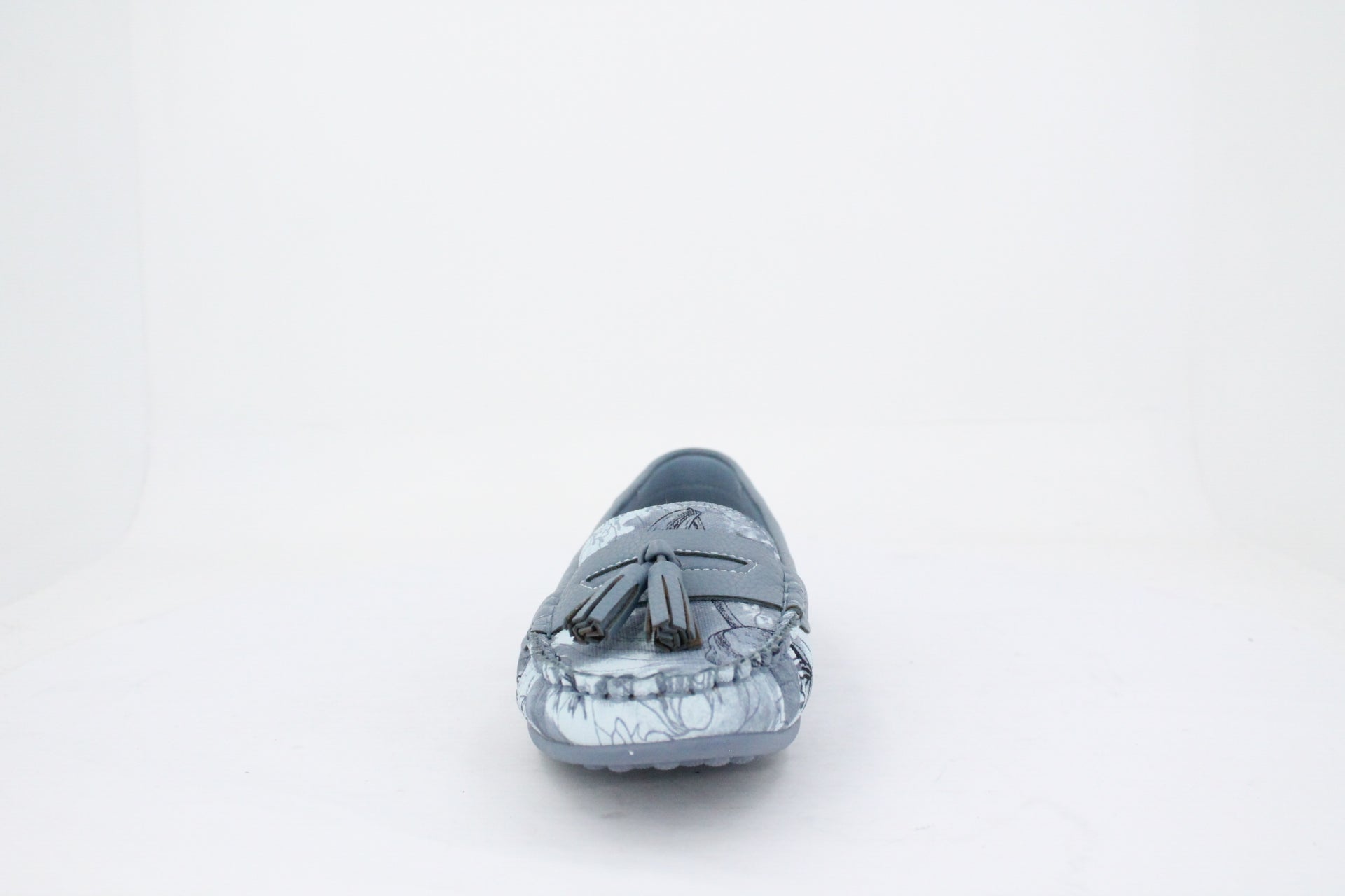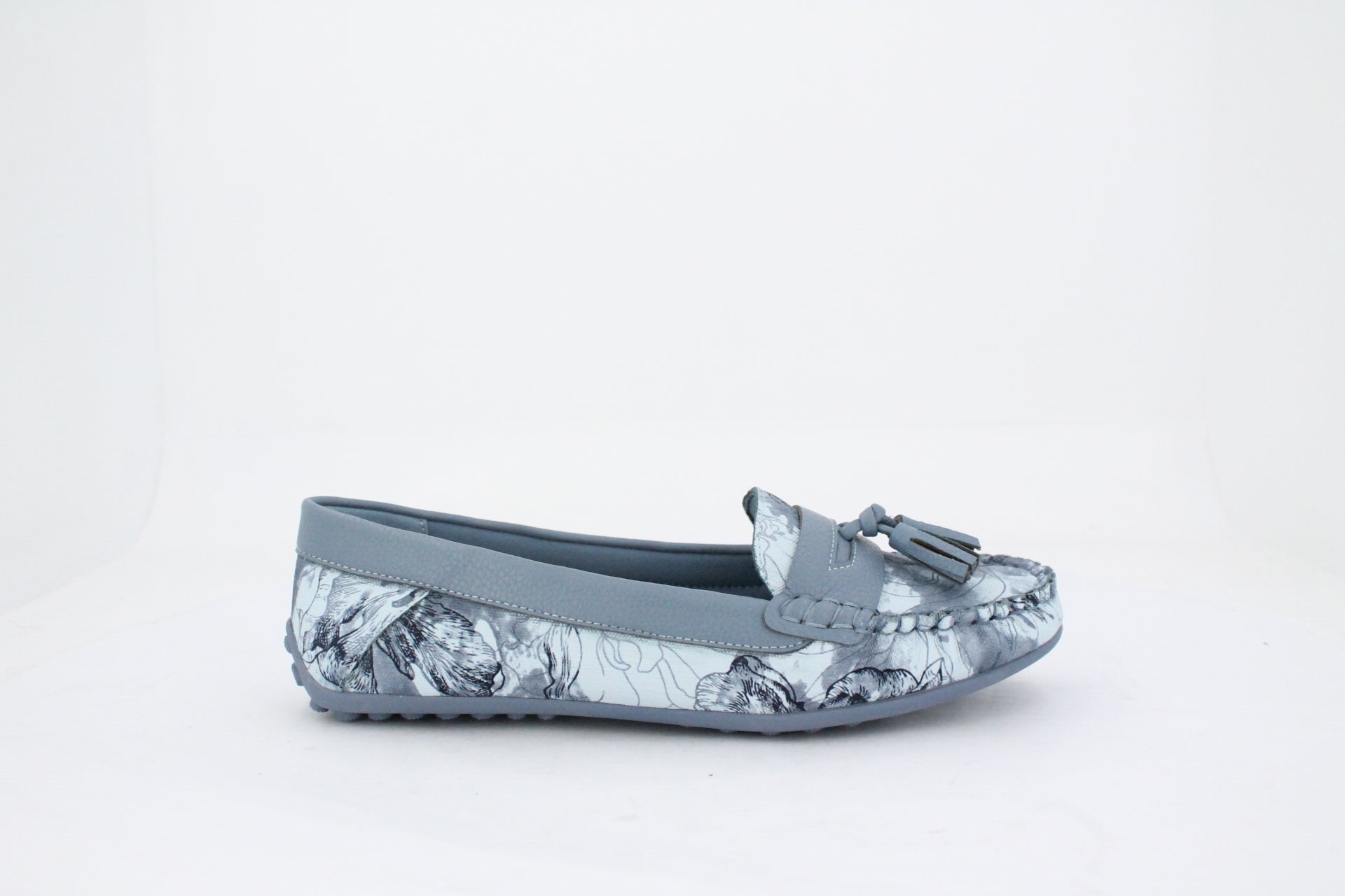 Step into sophisticated comfort with these charming moccasins, featuring a beautiful powder blue and grey floral print. Designed for easy slip-on style and these has a matching handbags, making them a stylish choice for everyday elegance.