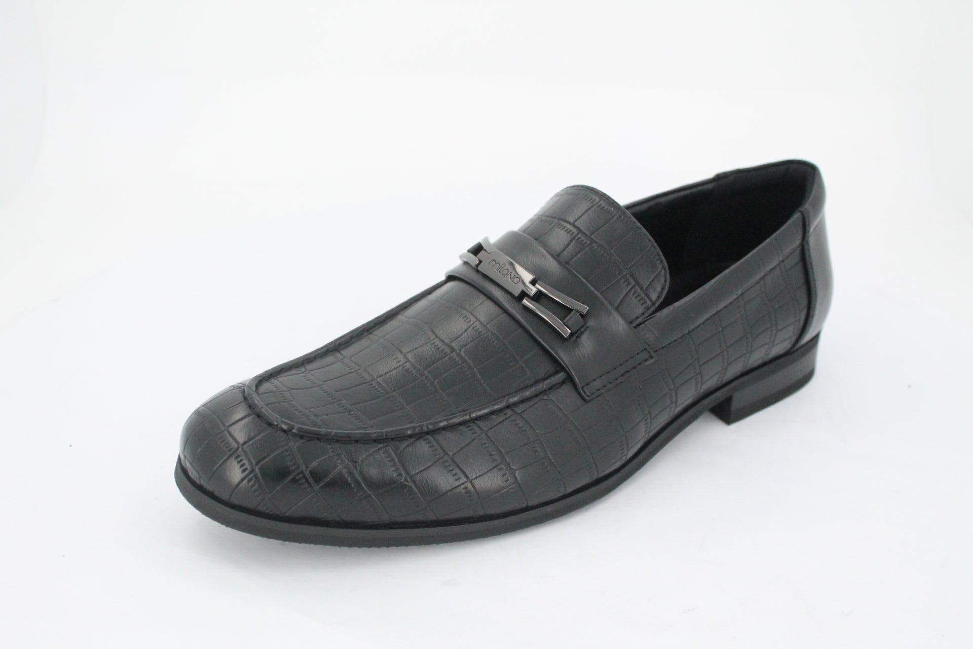 Elevate your formal wardrobe with this timeless leather like loafer, crafted for the modern gentleman. Featuring a sleek silhouette and a high-shine finish, this shoe is defined by its elegant metal trim detail across the vamp—adding a refined touch of sophistication. The cushioned insole and durable outsole ensure all-day comfort, making it perfect for business meetings, evening events, or upscale occasions. Pair it effortlessly with tailored suits or dress trousers for a polished, confident look.