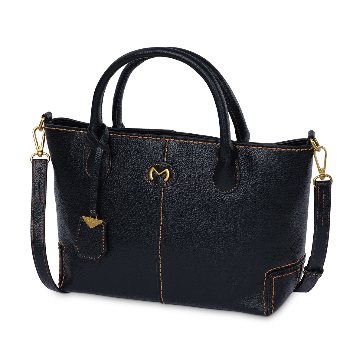 Black grainy faux leather premium tote with sophisticated contrast detail, branded with our signature M plate and detachable luggage tag. Featuring internal phone pockets and detachable, adjustable long strap