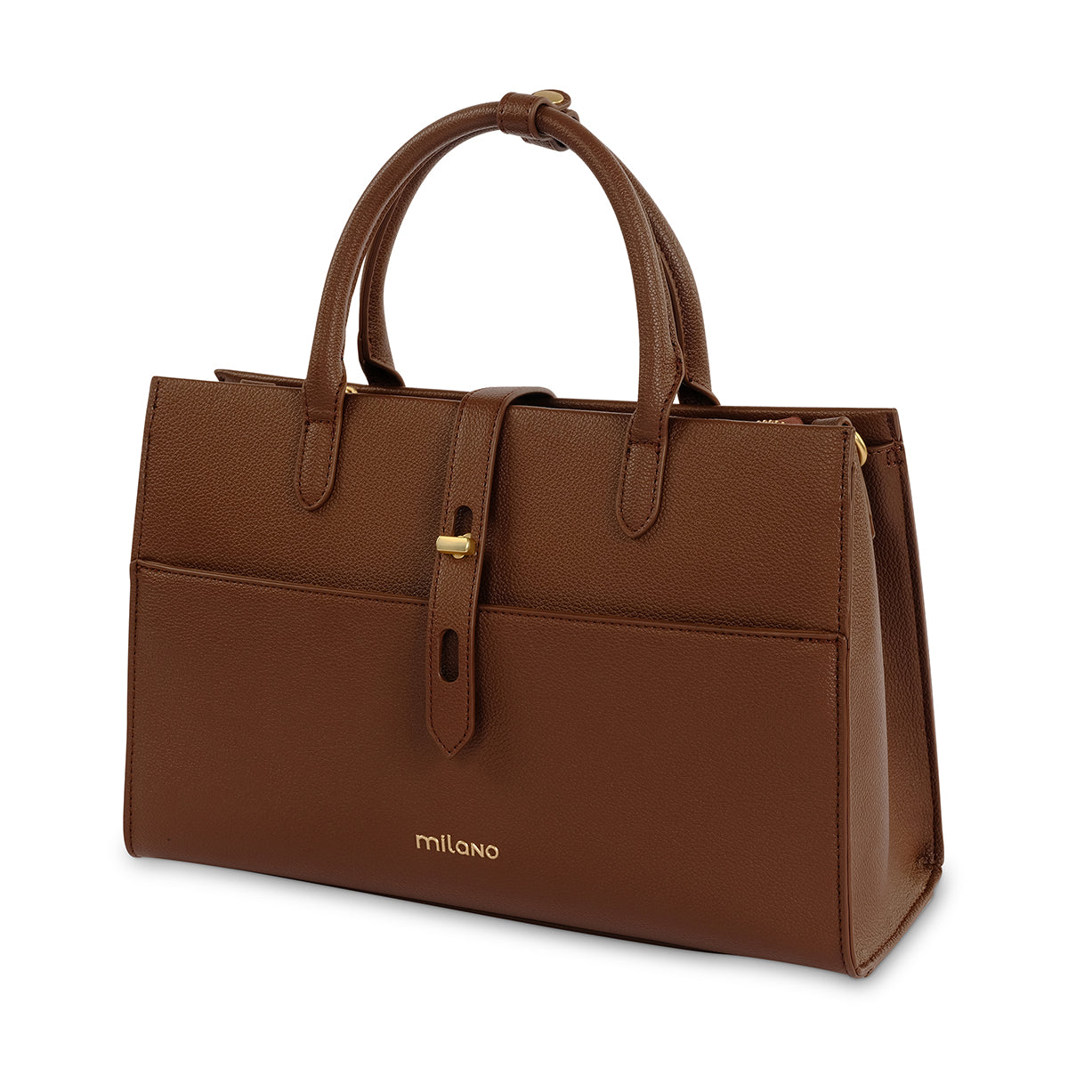 The Alana tote in a sophisticated taupe is a perfect blend of style and function. This structured tote features a clean silhouette, a unique top handle, and an elegant strap with a polished gold-tone clasp. It’s a versatile and timeless piece that is perfect for work or daily use, adding a touch of classic elegance to any outfit.