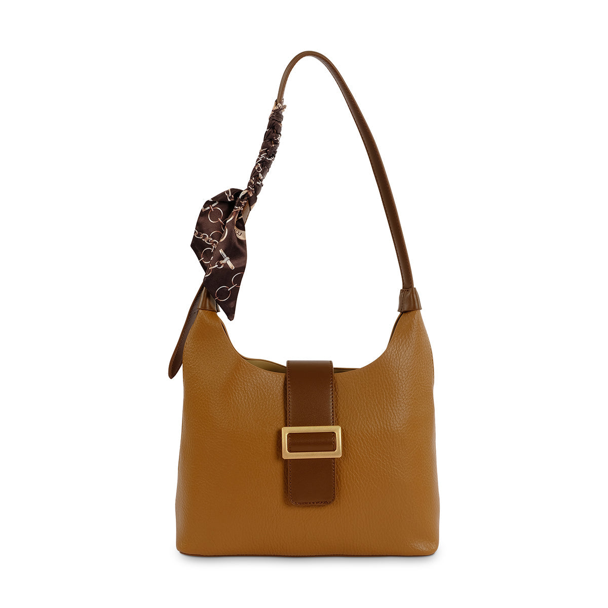 This bag is a versatile and chic hobo style with a sophisticated silhouette. Its relaxed yet structured form is complemented by a curved top handle and a comfortable, detachable shoulder strap. The bag's tan body is beautifully contrasted by a brown strap, making it a stylish and easy accessory for daily use.