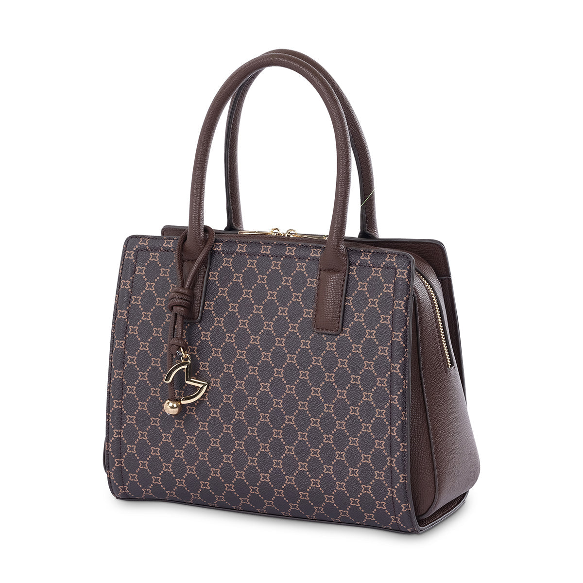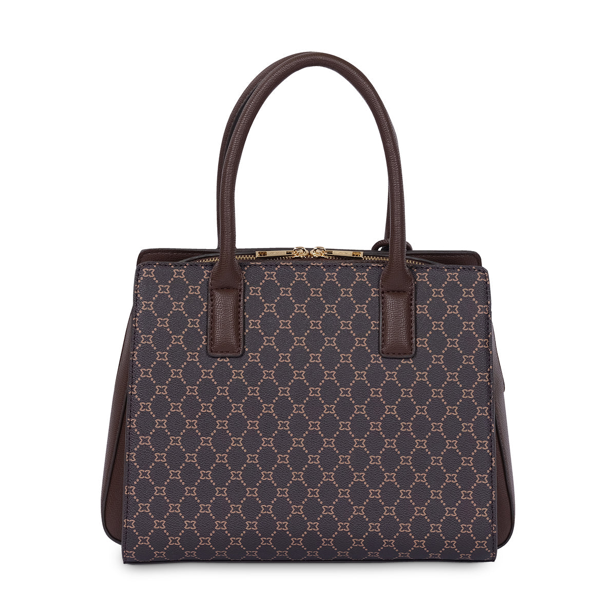 A premium brown monogram tote with multiple compartments for maximum storage and a combination of hidden magnetic closures in addition to a secure zip compartment. Featuring detachable branded charms, twin handles and an adjustable long strap