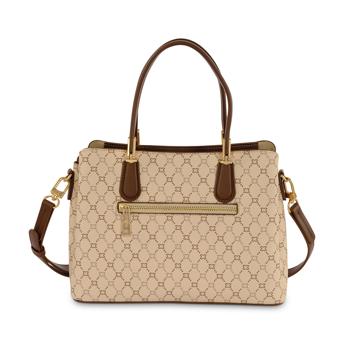 The Natalie is a sophisticated take on a classic tote. Adorned with a subtle all-over monogram pattern, this bag features a structured shape and a rich brown trim. The unique top handles and prominent branding add a touch of timeless style, making it a polished accessory for both work and daily outings.