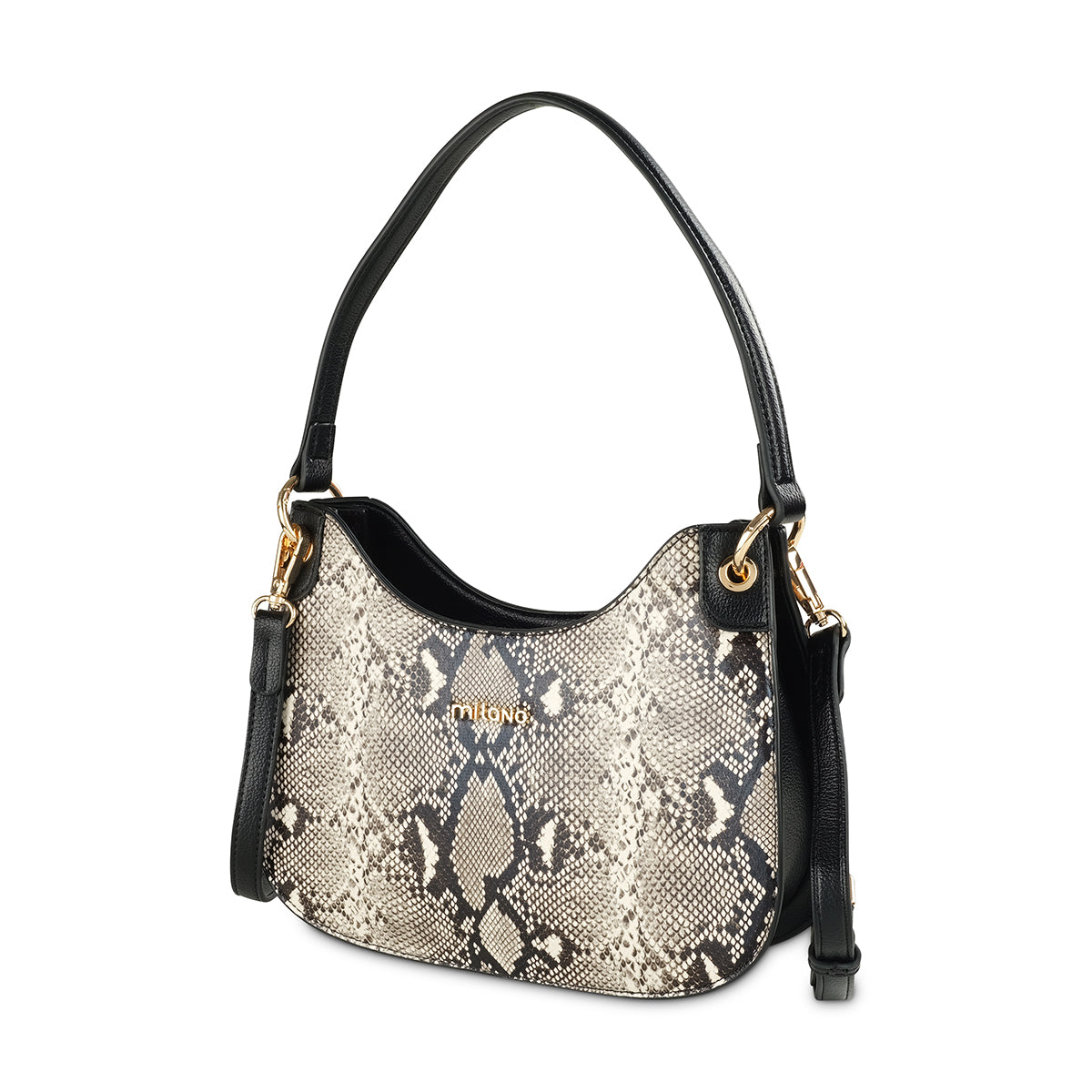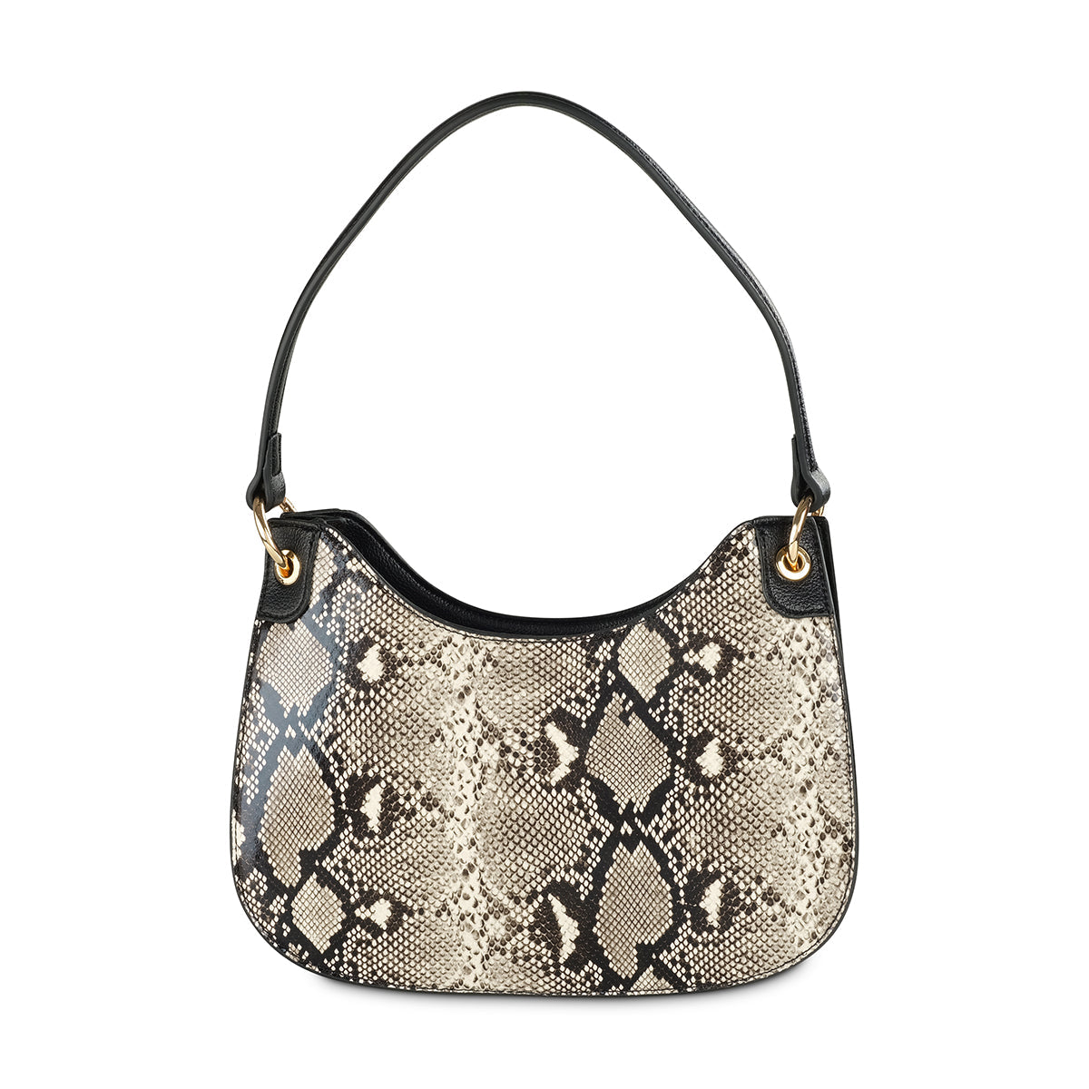 Make a bold statement with the 'Calla' shoulder bag. This effortlessly chic bag is crafted from a striking snakeskin-embossed material and finished with sleek black accents. The slouchy silhouette, combined with gleaming gold-tone hardware and a detachable shoulder strap, makes it a versatile accessory that transitions from day to night with ease.