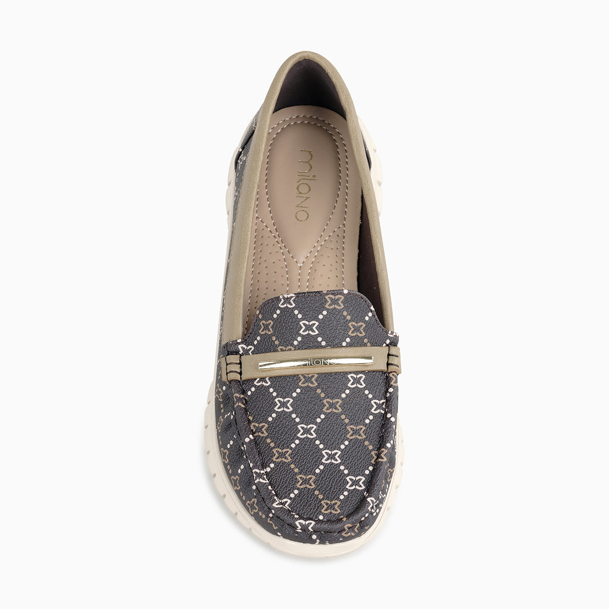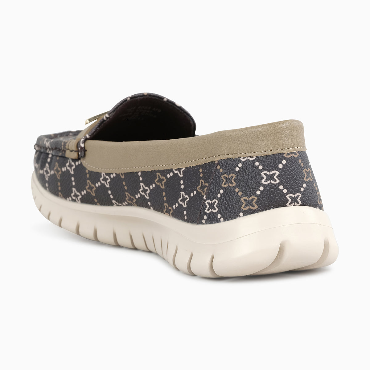 Comfortable loafers featuring an all-over monogram pattern, sleek trim, and a decorative metal accent. Designed with a cushioned footbed and lightweight flexible sole for everyday wear