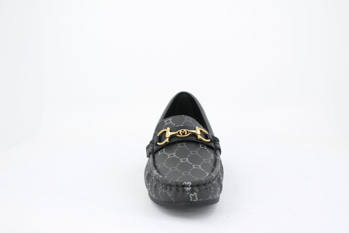Step into sophisticated style with these ladies' slip-on moccasins. Featuring a new Milano monogram patterned upper in a dark gray hue. The low wedge heel ensures comfort, making them perfect for both casual and semi-formal occasions.