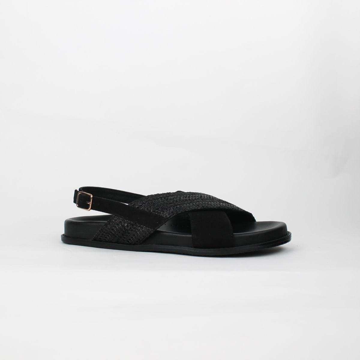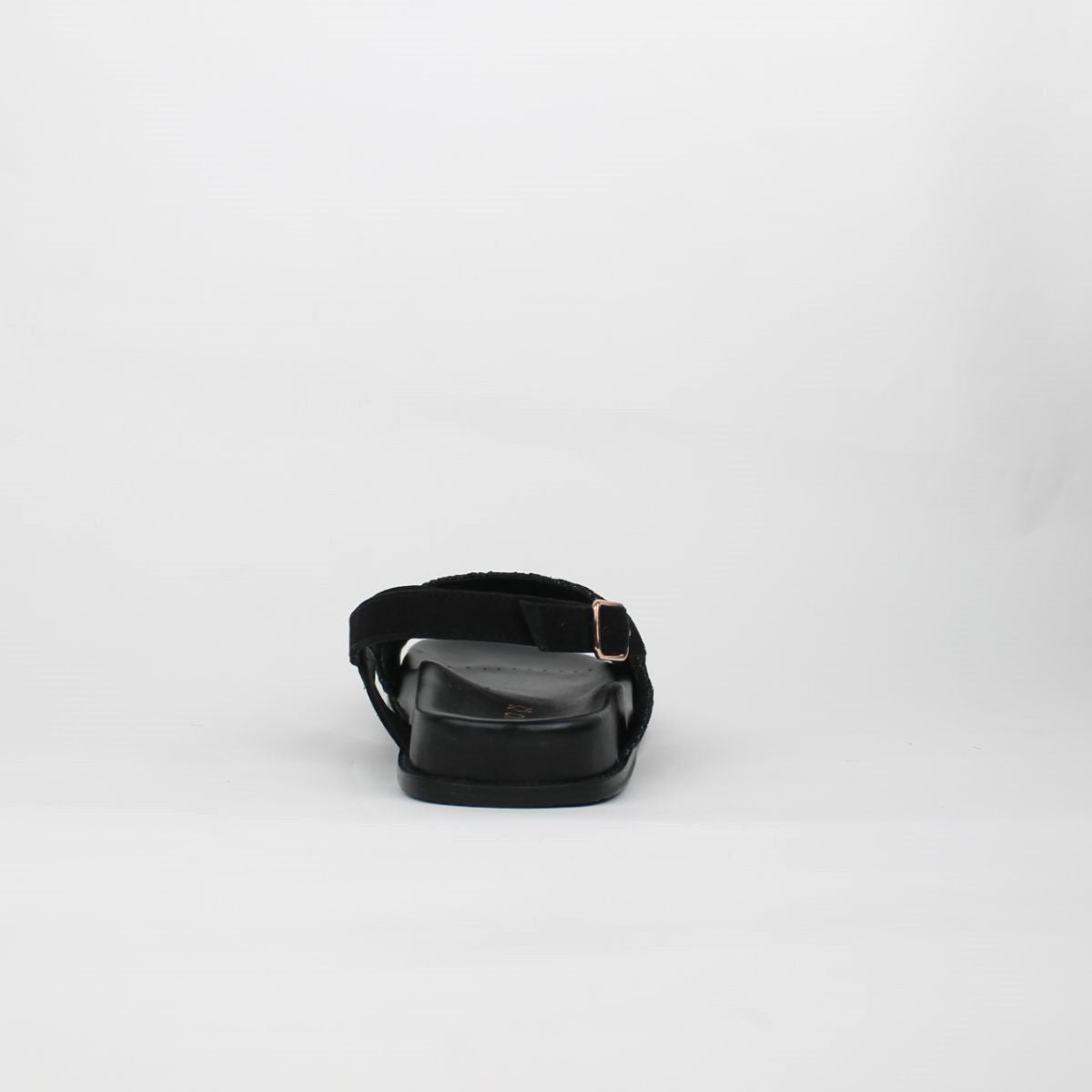 Modern criss-cross strap upper, combining smooth and textured suede panels.It has an adjustable slingback strap with a sleek metallic buckle for a secure fit. Durable black platform sole for enhanced comfort and support. This sandal is designed for all-day wearability.