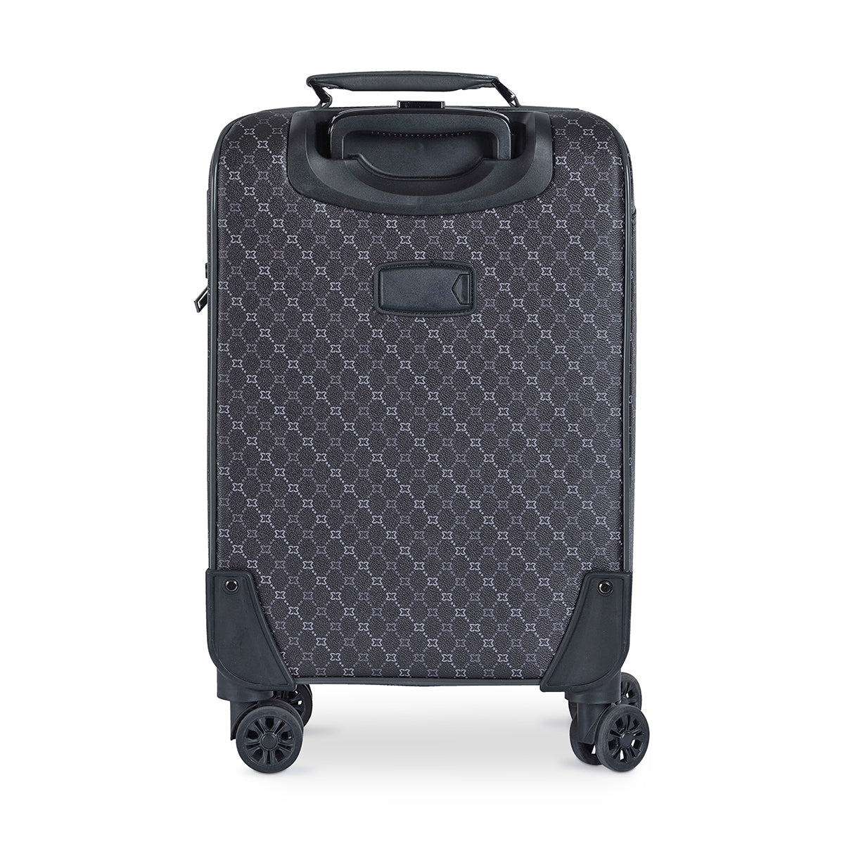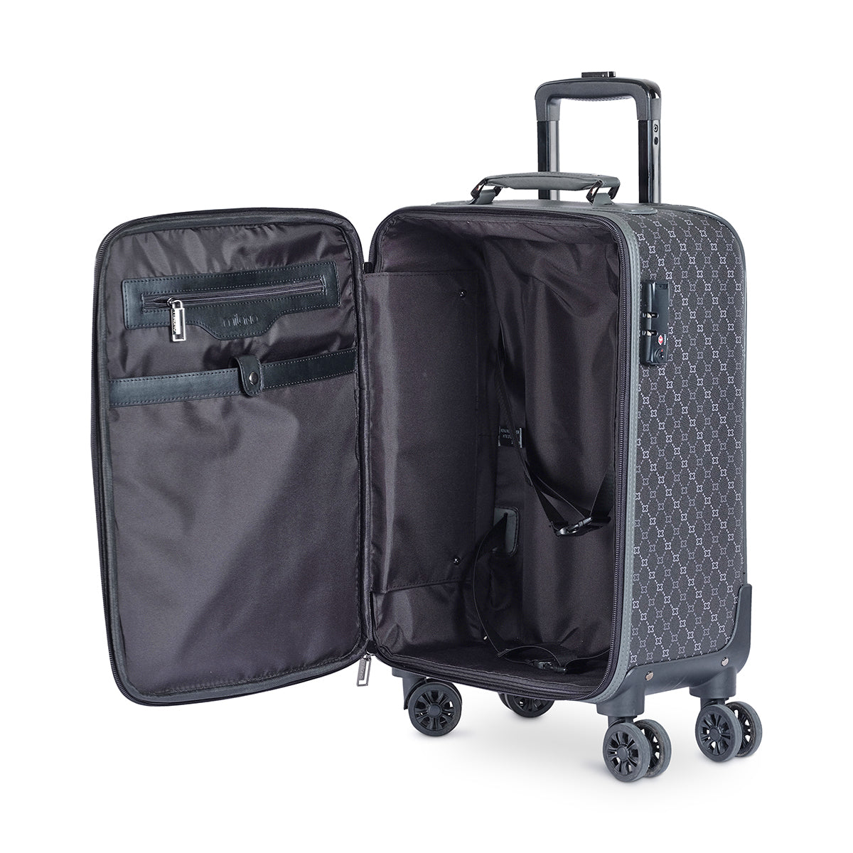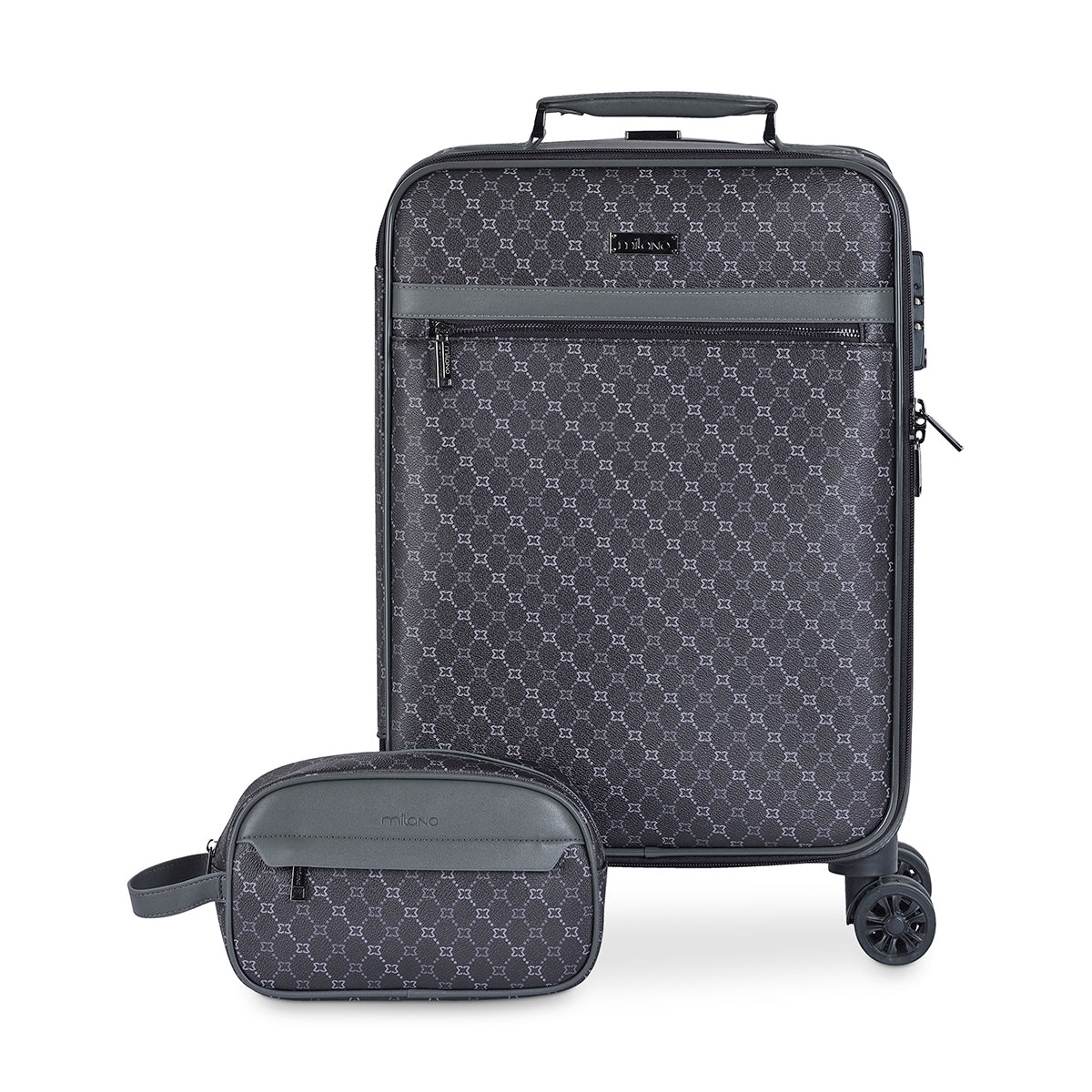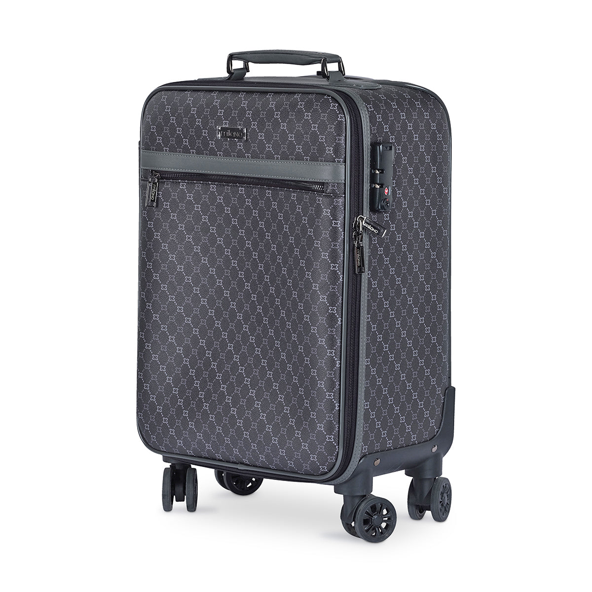 Travel with confidence with the 'Kenji' spinner suitcase. Designed for both style and practicality, this durable carry-on features a sophisticated dark grey monogram, textured finish and secure zipper closures. The telescopic handle and four multi-directional spinner wheels provide seamless mobility, while the spacious interior and exterior pocket offer smart organization. Complete with an integrated lock for security, the 'Kenji' is your go-to for hassle-free journeys