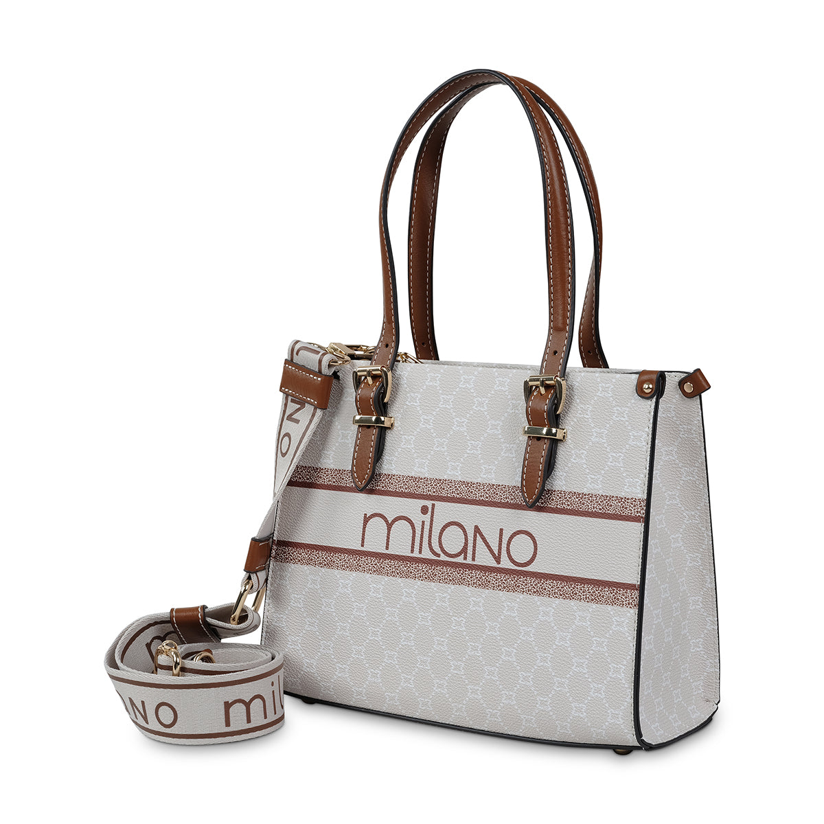 This beige and brown monogram tote features our signature logo, rich faux leather handles, gold-tone accents, and a chic logo charm. Its structured design offers a spacious interior—perfect for effortless everyday style.