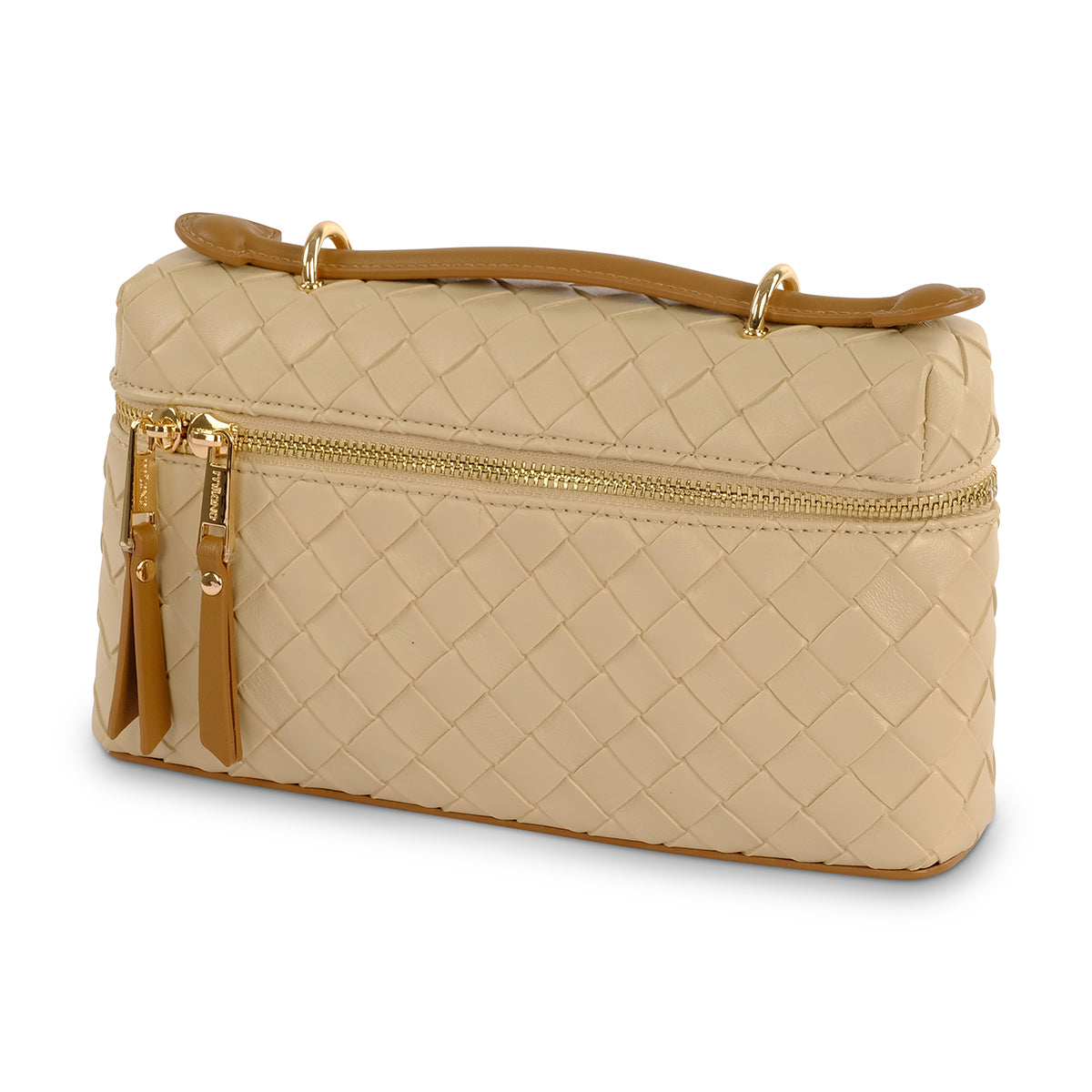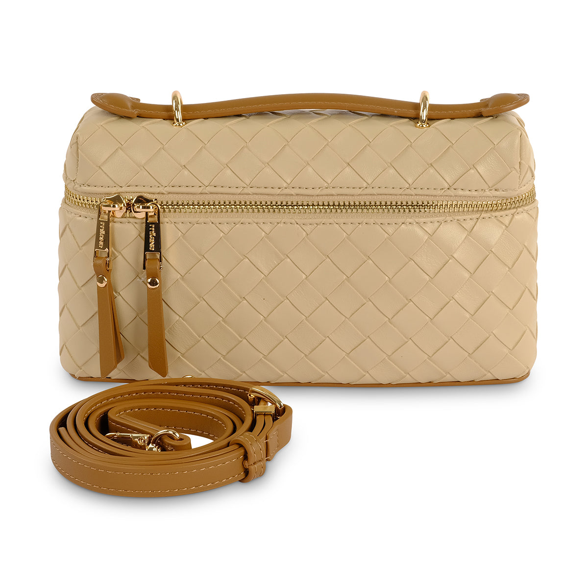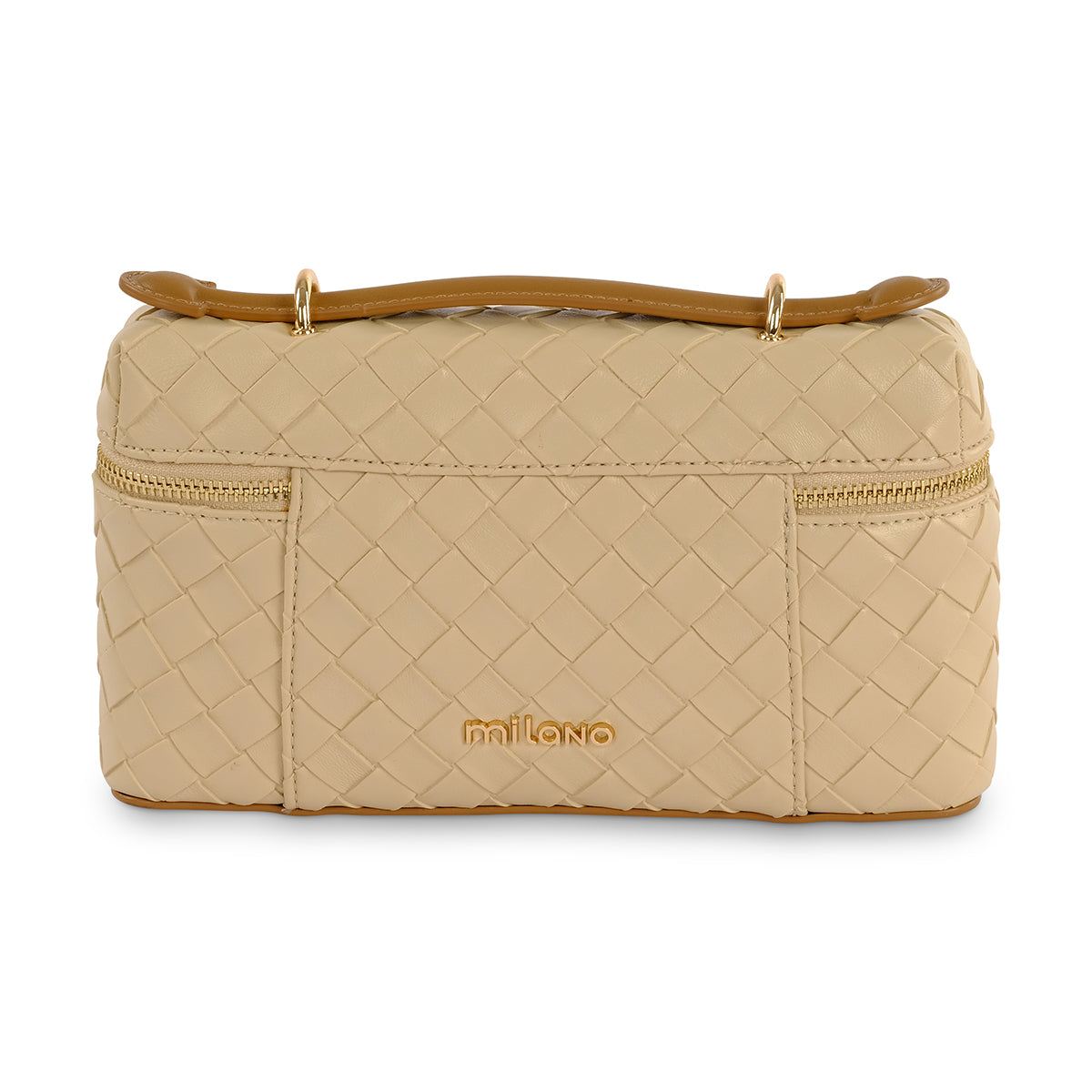 Beige weave detail grab bag with Milano branded hardware. Featuring main zip closure and internal phone pockets for added security, as well as a detachable and adjustable long strap