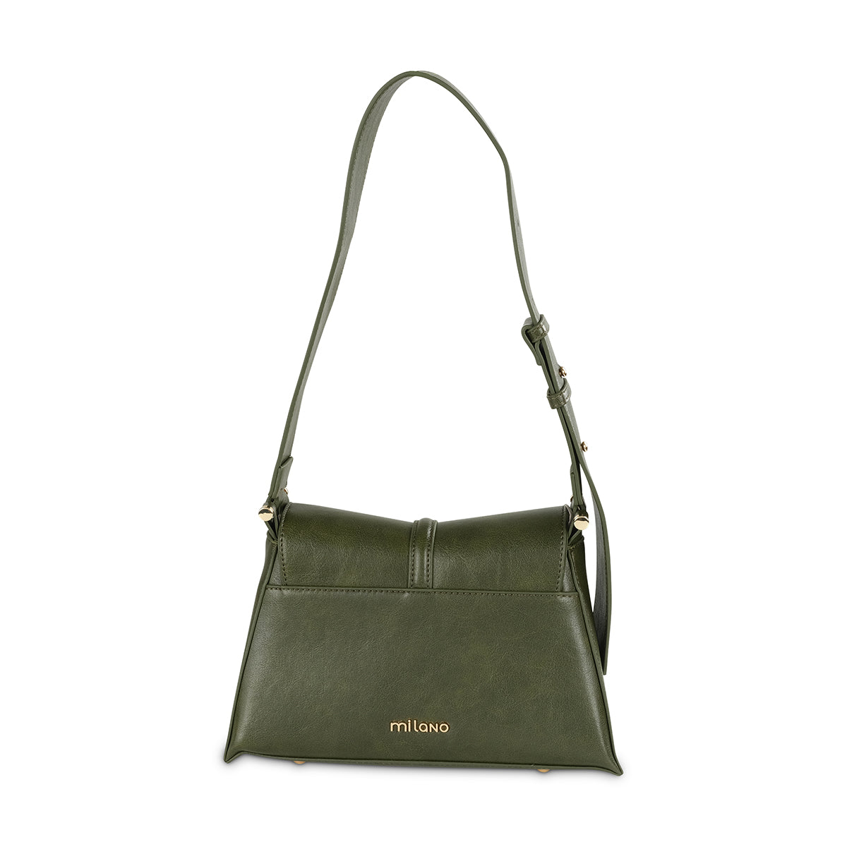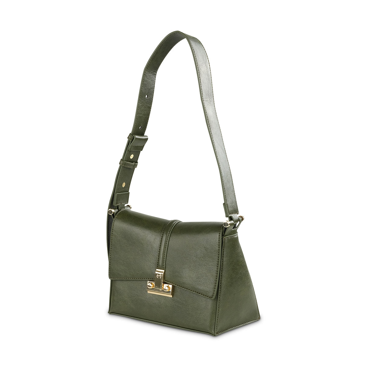 Khaki faux leather crossbody with geometric paneling, M branded premium lock and adjustable long strap. The internal phone pockets and zip pocket are ideal for organization and keeping your belongings secure