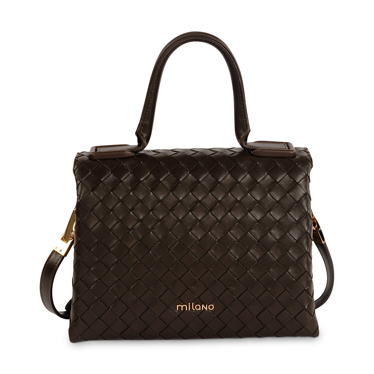 Drak Brown weave detail satchel with stylish Milano branded hardware. Featuring a main zip closure and internal phone pockets for added security, as well as a detachable and adjustable long strap