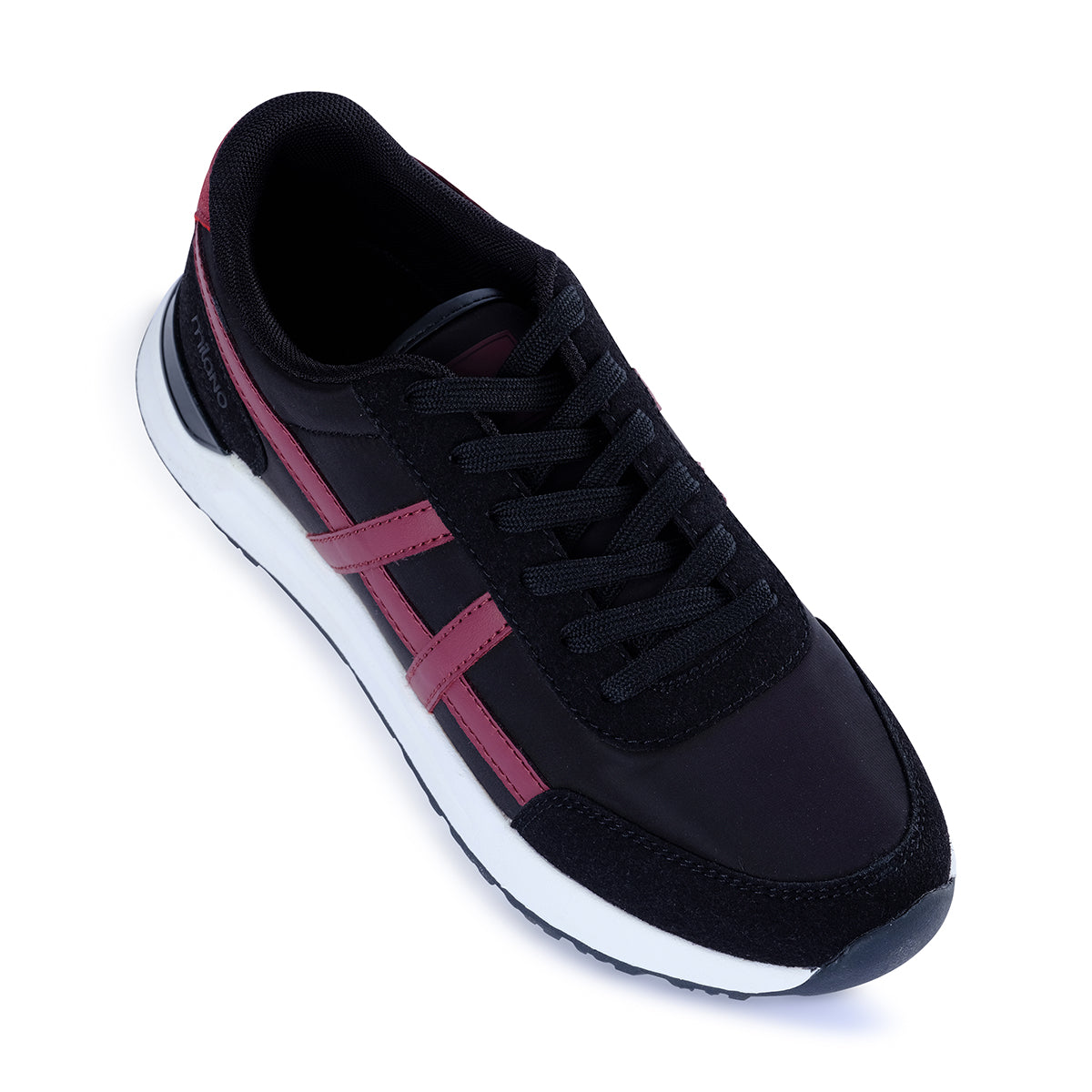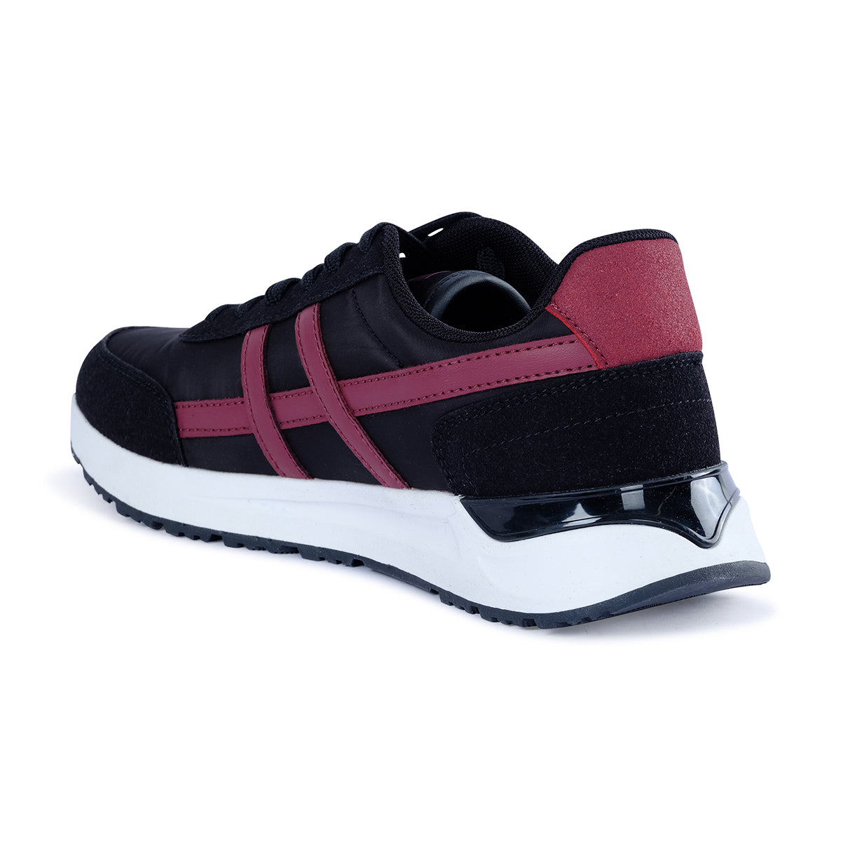 Sporty meets sleek—black sneakers with bold maroon accents and a cushioned white sole for all-day comfort and effortless style.