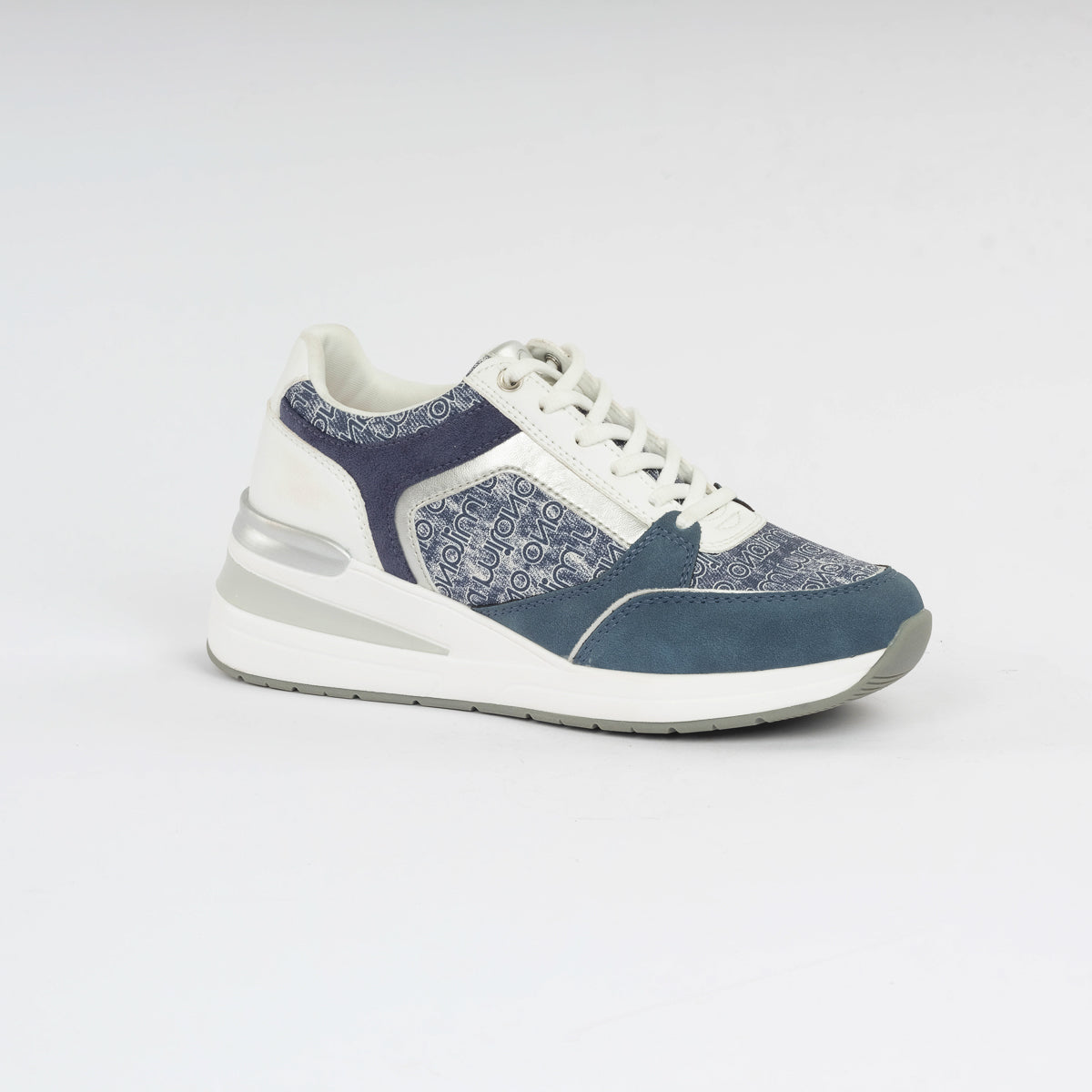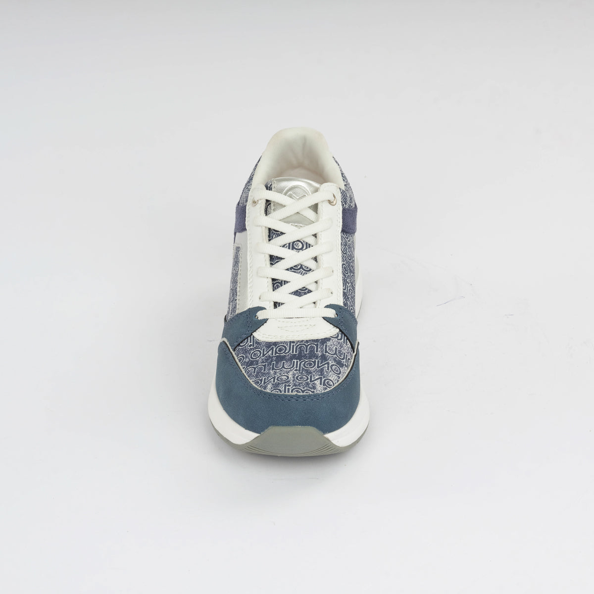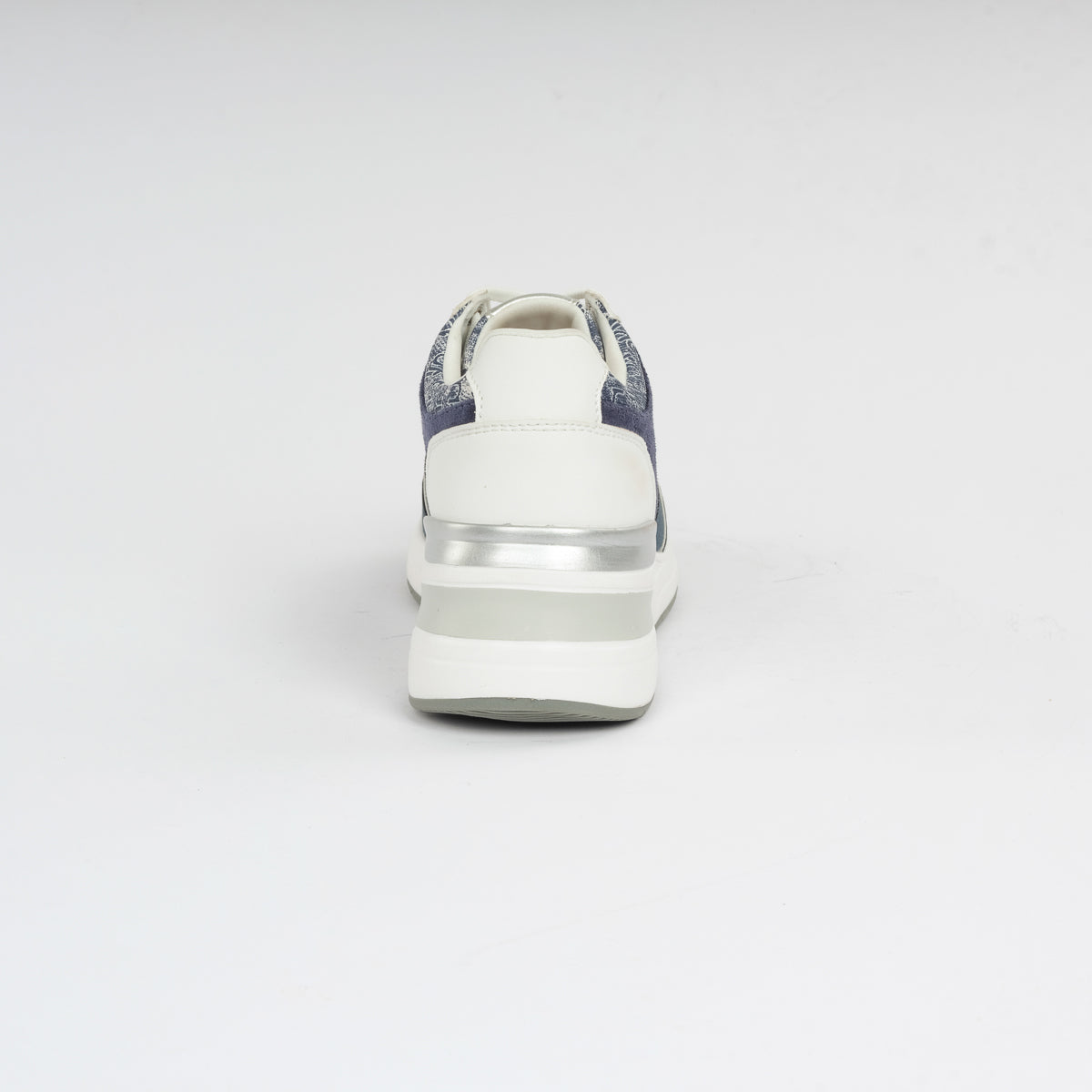 Fresh and versatile—white and navy sneakers with textured panels and a cushioned sole for a sporty yet stylish look.