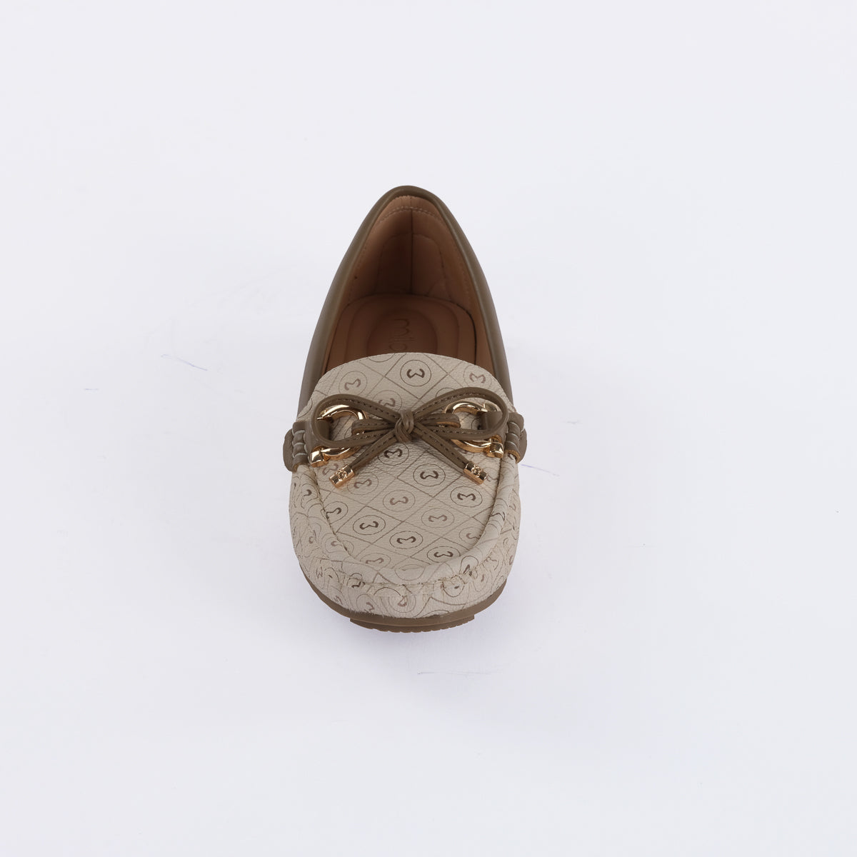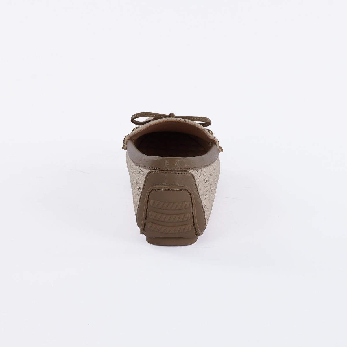 Classic beige monogram moccasins with a sleek slip-on design, accented by a chic bow and metallic details. Perfect for effortless sophistication and all-day comfort.