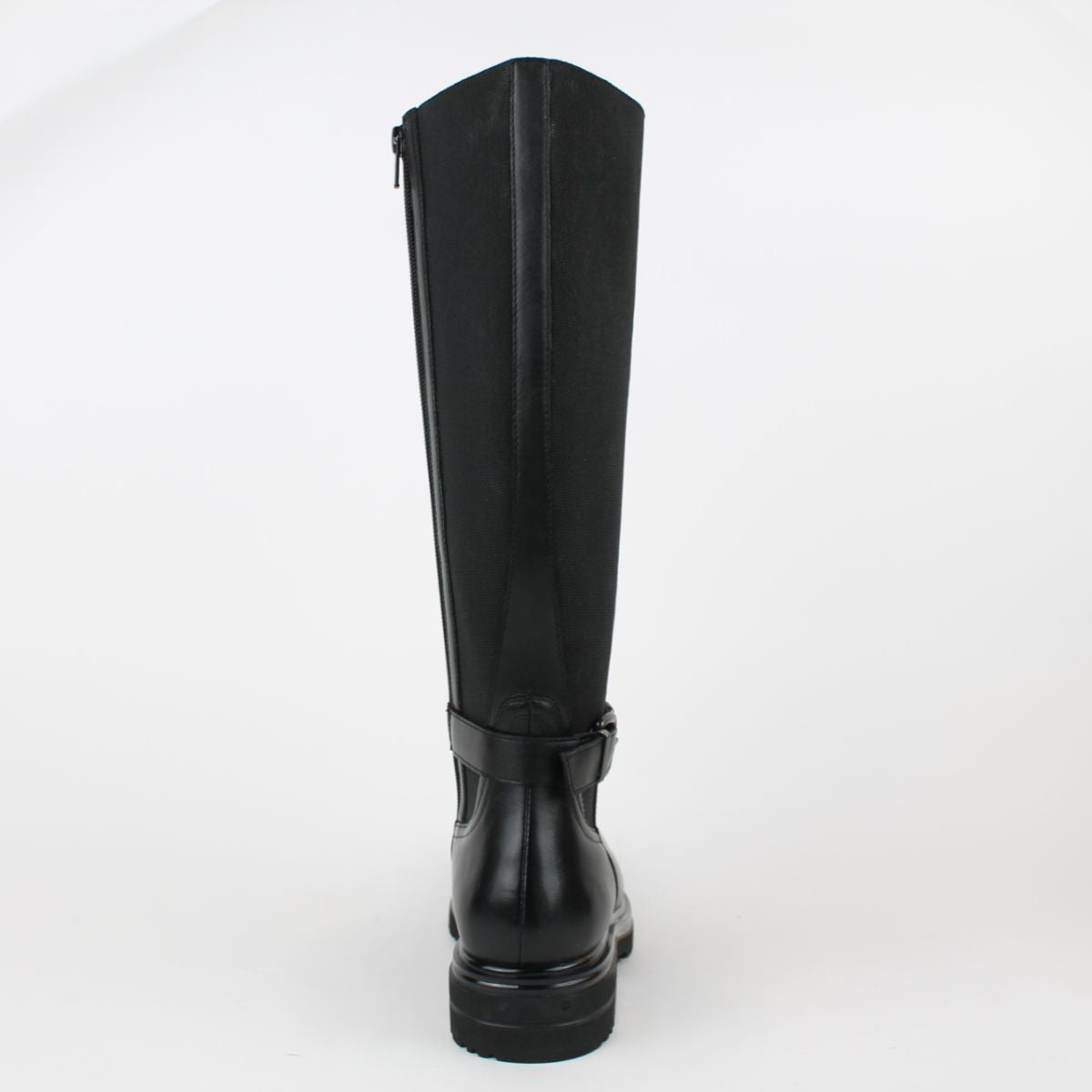 Classic Leather Riding Boot. Crafted with a premium leather upper, this boot features a polished silhouette that extends to the knee. Designed for both style and comfort, it includes a sophisticated decorative strap with a metal buckle and a full-length elastic panel on the back for a perfect, flexible fit. The low, lugged sole ensures a comfortable and stable stride, making this boot a versatile and chic addition to your cold-weather wardrobe.