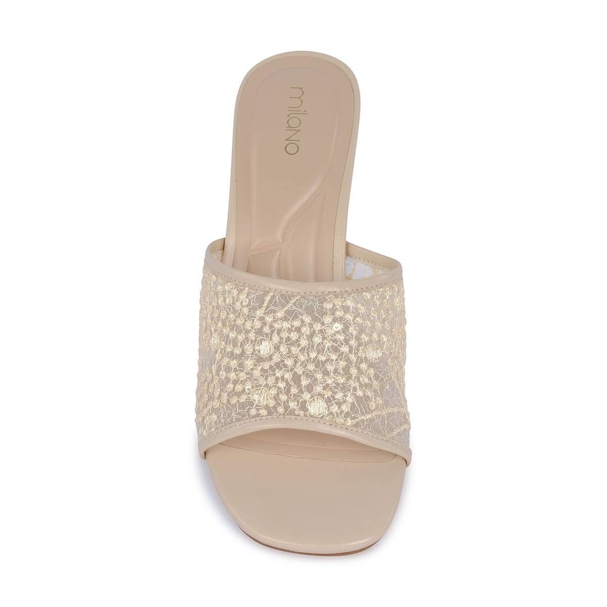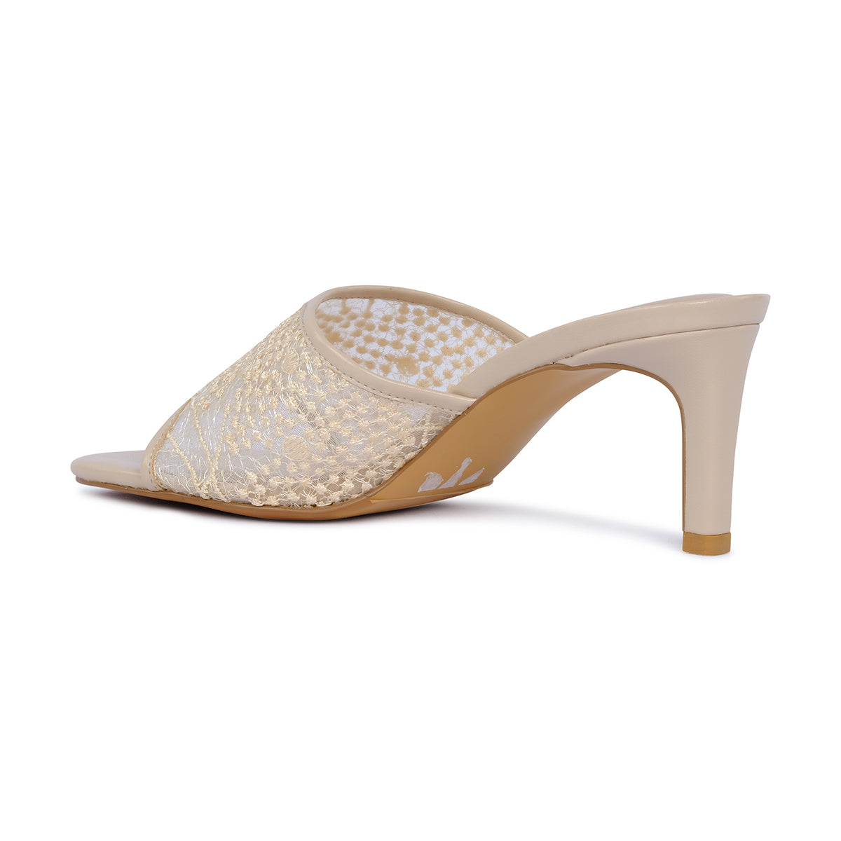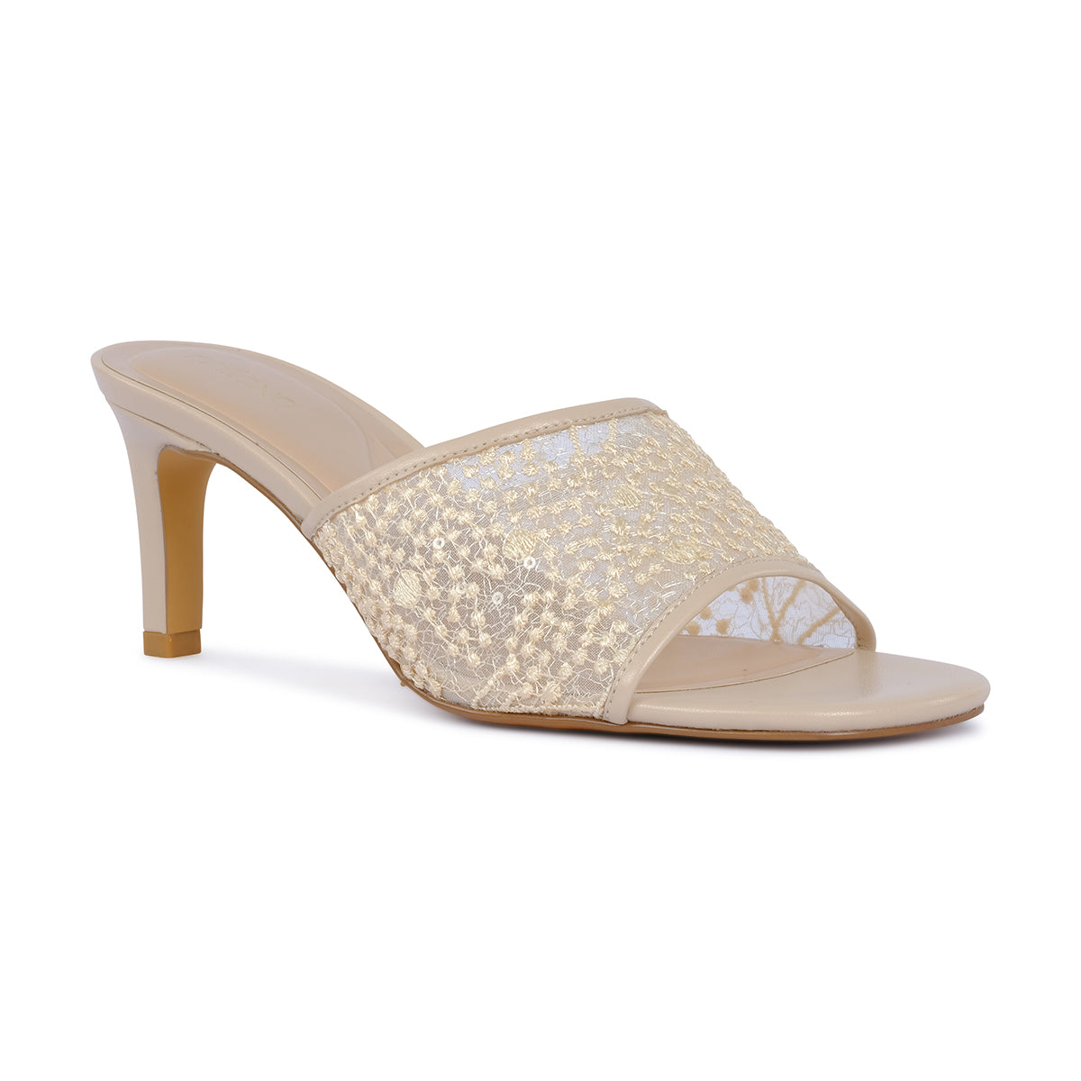 Elevate your evening look with these sophisticated slip-on mules. Featuring a breathable sheer mesh strap adorned with shimmering tonal crystals, these sandals offer a perfect blend of modern texture and timeless glamour.