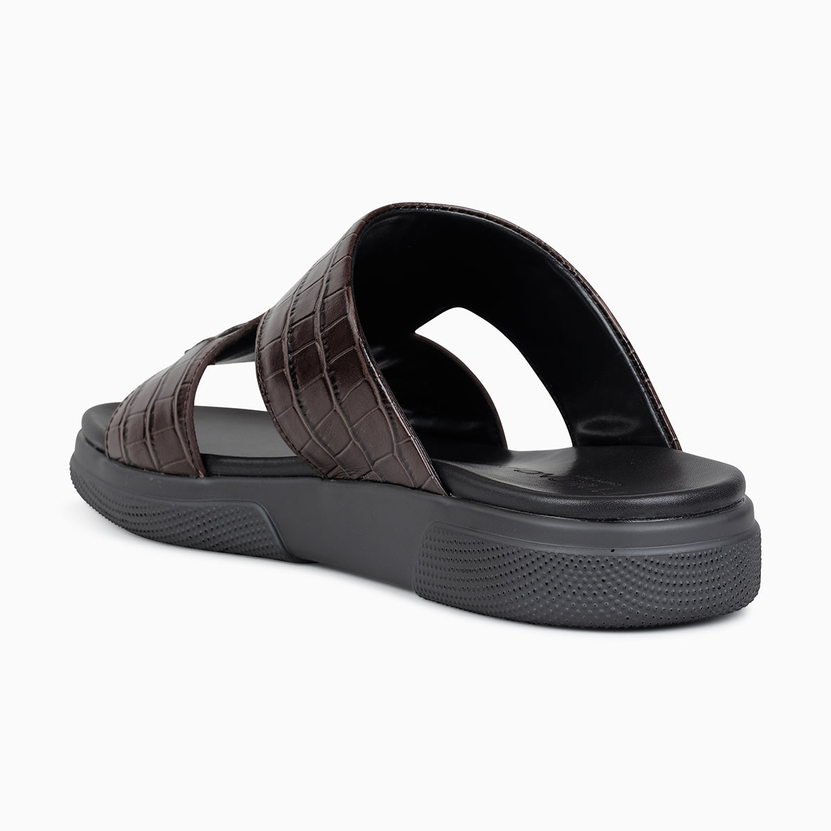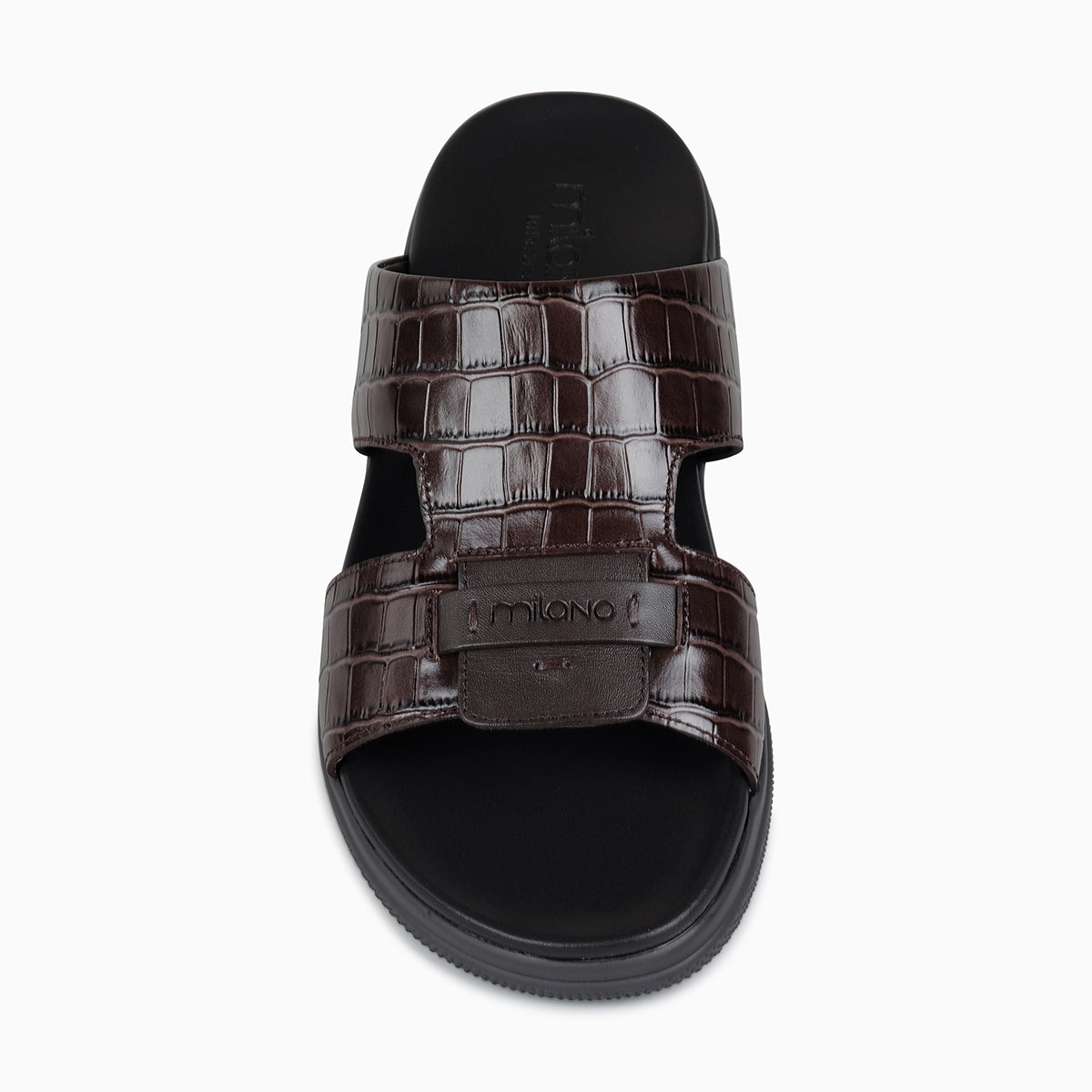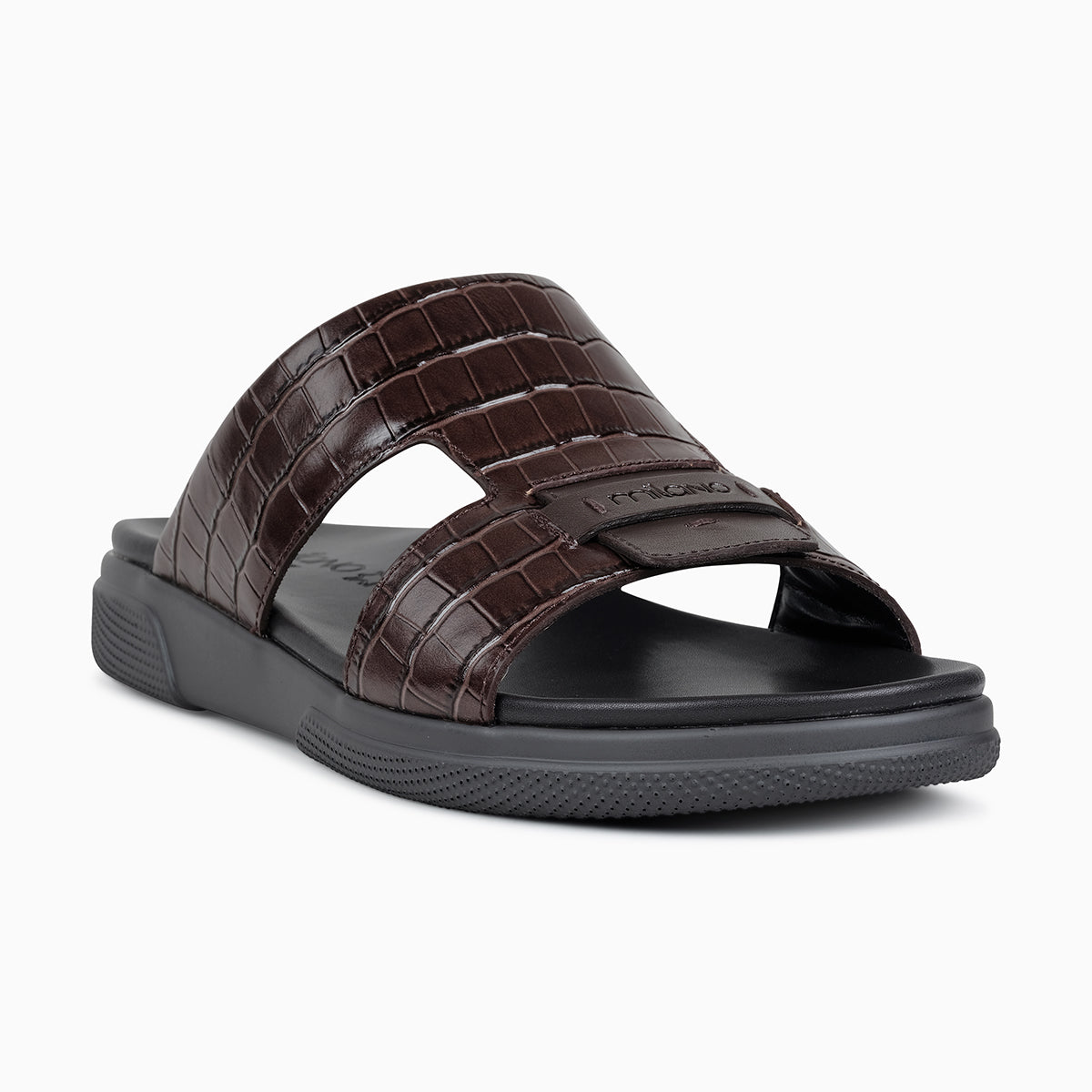Crafted from premium leather, the Selleck sandals features a sophisticated textured finish that adds refinement and depth to our sandal's collection. The wide cross-over straps provide a secure fit, while the subtle embossed branding enhances the refined look. Designed for all-day wear, the sandals come with a soft cushioned footbed for exceptional comfort and a durable, slip-resistant sole for stability and long-lasting performance and a soft leather material that provides a sophisticated and premium look. Perfect for casual outings, relaxed weekends, or smart-casual occasions, these sandals combine luxury and practicality effortlessly.