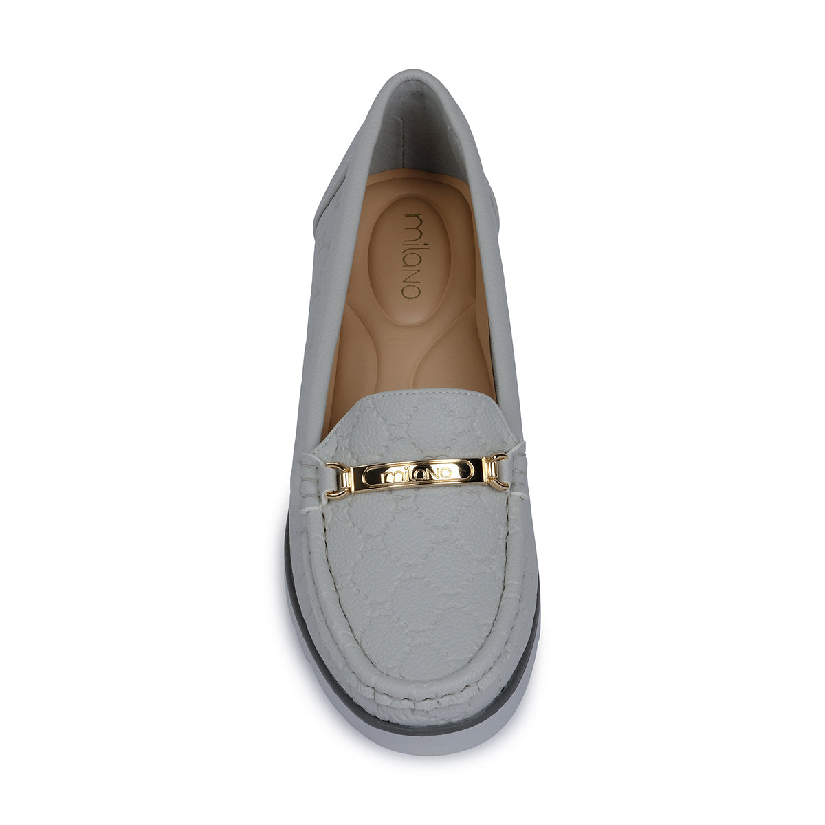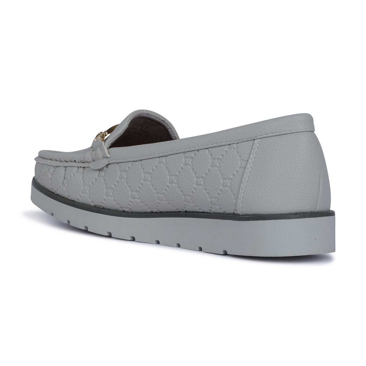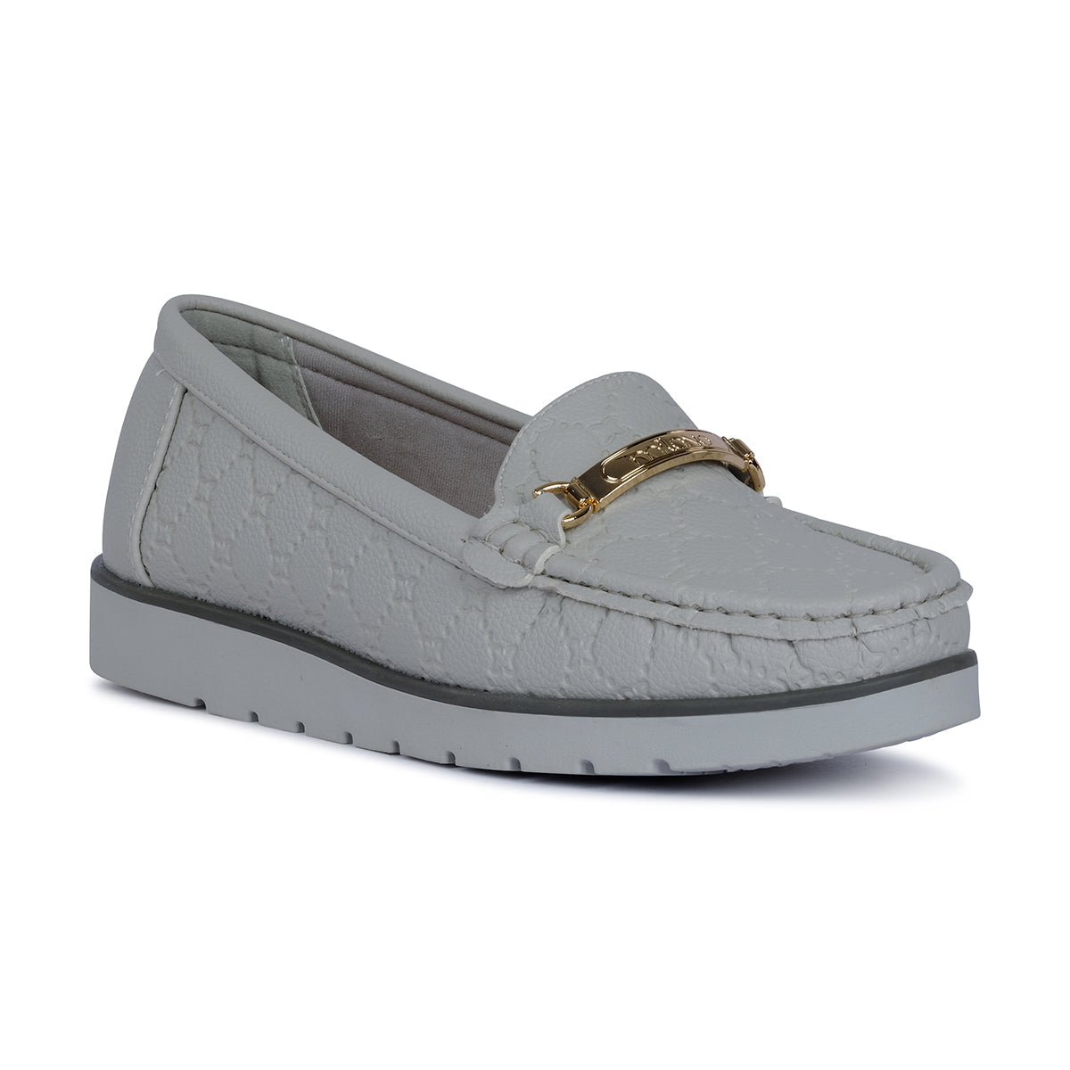 Sleek grey moccasin with embossed monogram texture and a polished metal bar accent. Set on a lightweight platform sole for a modern twist on classic sophistication.