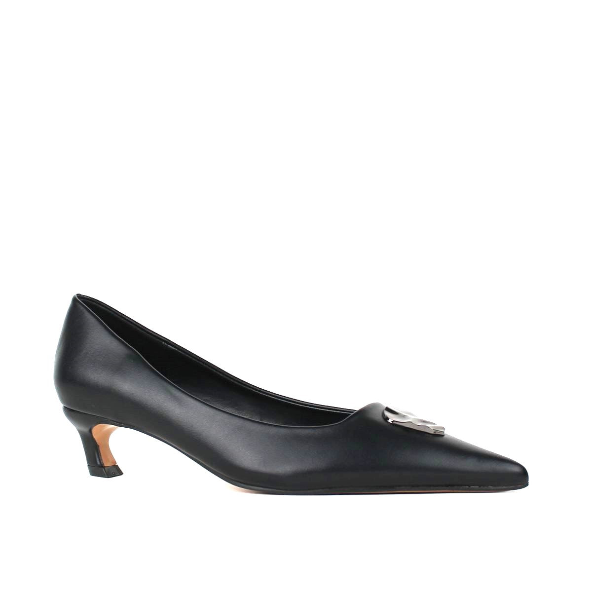 Elegant pumps featuring a sleek pointed toe and a sophisticated kitten heel. Crafted from smooth leather, these shoes are adorned with a polished, decorative buckle on the front. A perfect choice for adding a touch of class to both professional and evening ensembles.