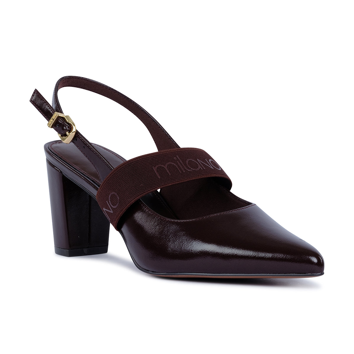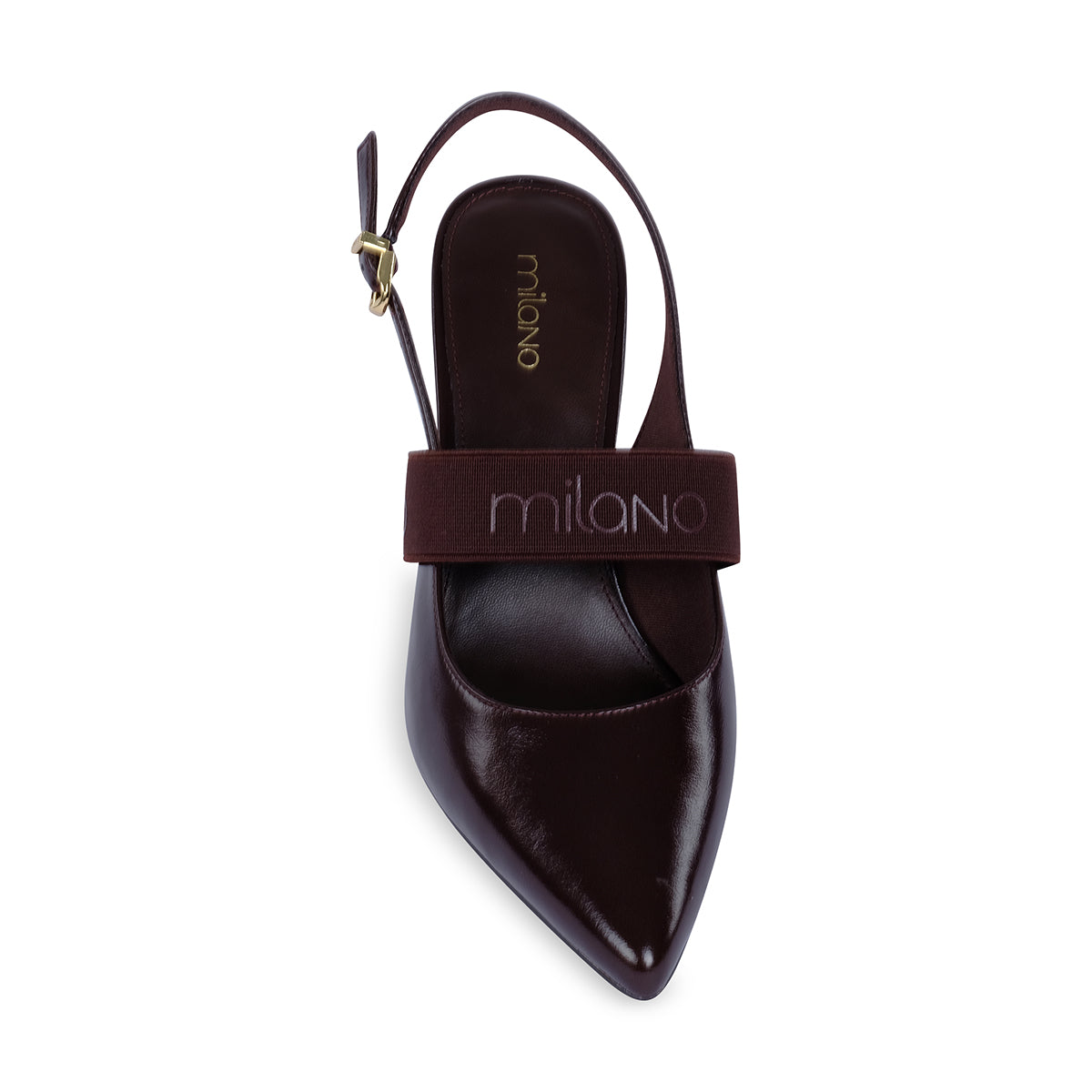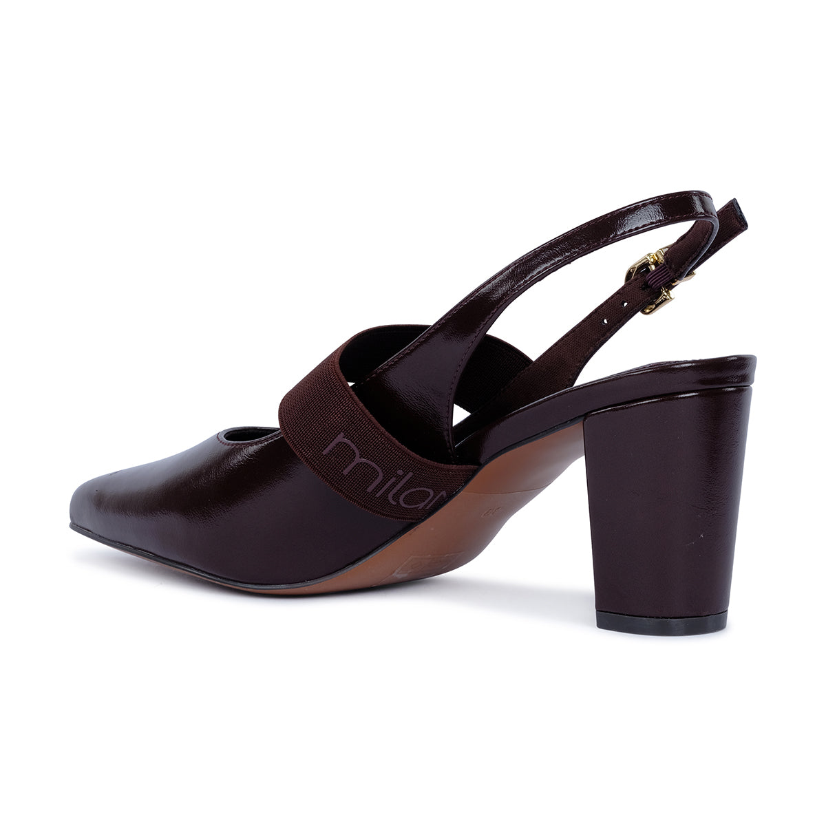 Sophisticated dark brown slingback pumps crafted in smooth faux leather, featuring a sleek pointed toe and a sturdy mid-block heel for effortless elegance. Enhanced with a wide elastic strap for a secure fit and a polished gold-tone buckle for a refined finish—perfect for day-to-night styling.