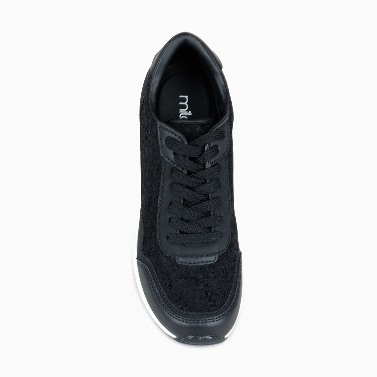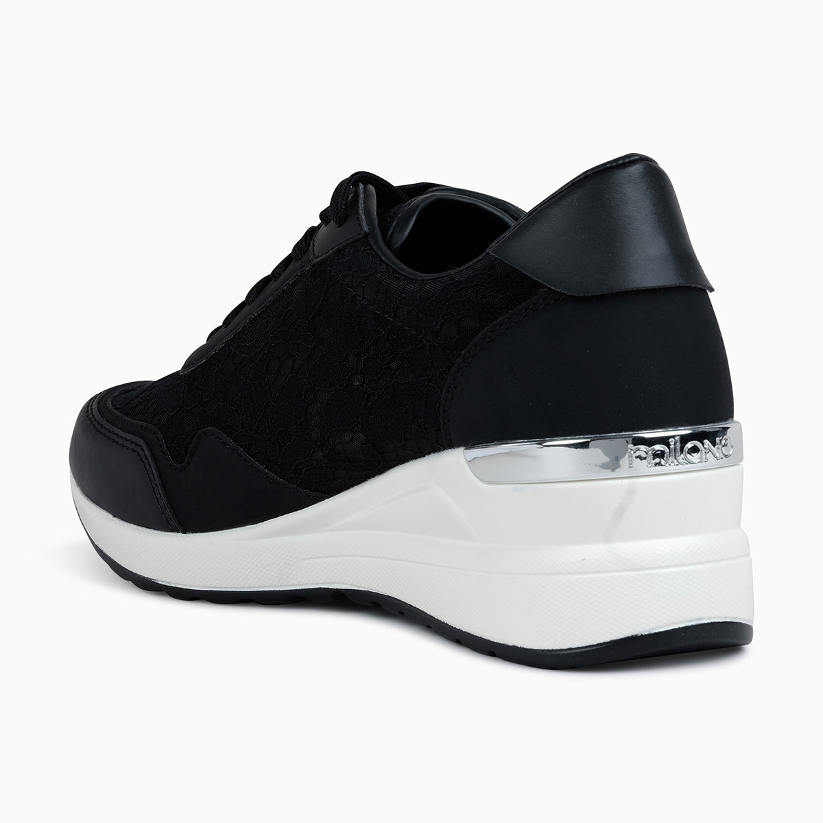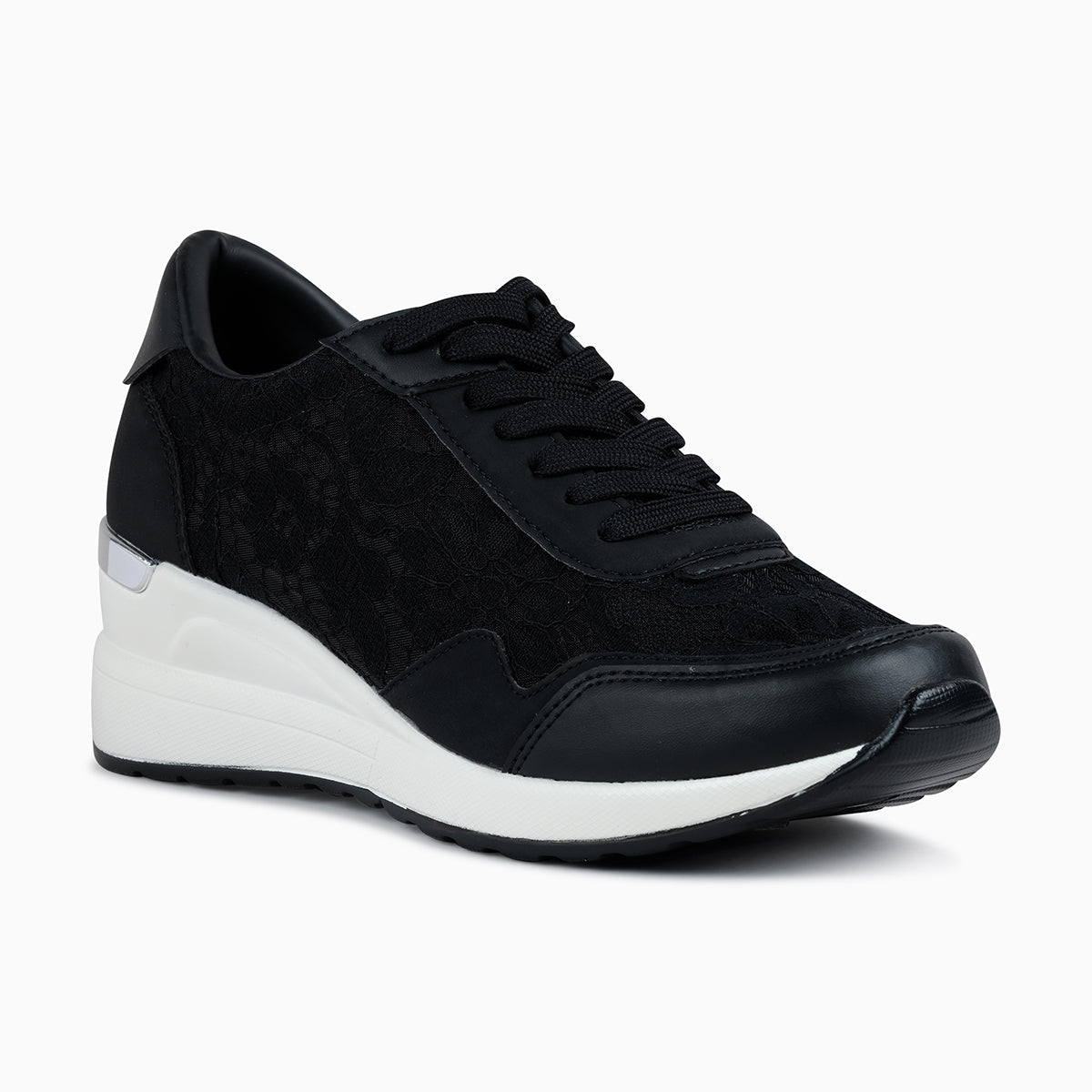 Stylish black sneakers featuring delicate lace panels and smooth leather accents. Designed with a cushioned insole and a chunky white sole for comfort and modern appeal. Ideal for elevating casual looks with a chic twist