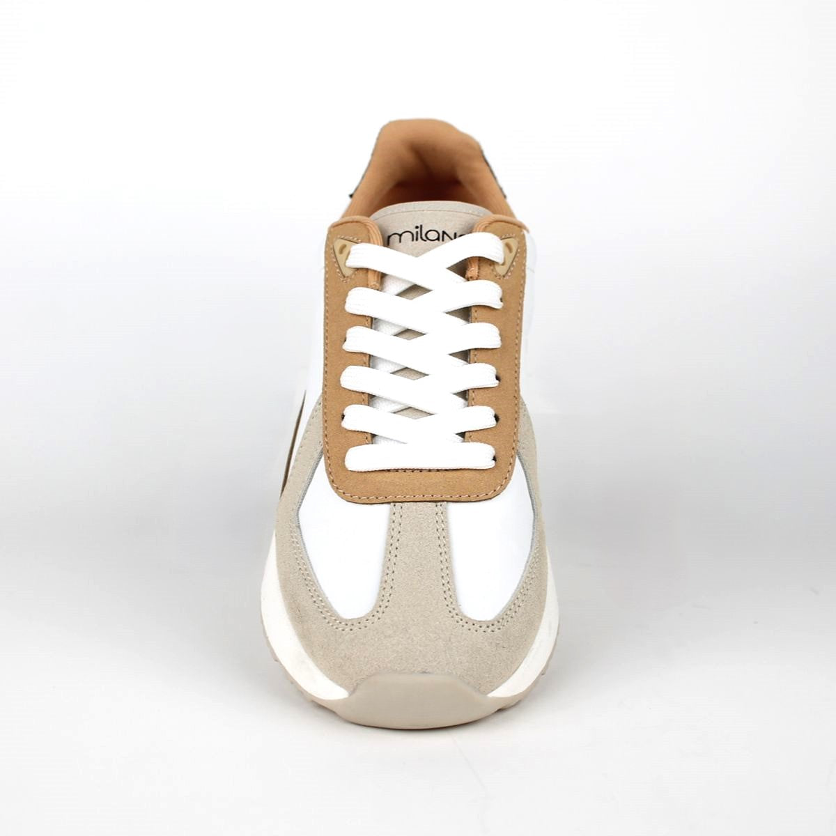 Stylish and versatile, these trainers feature a contemporary multi-tone design. The upper combines smooth white panels with tan and beige suede-like materials for a dynamic look. These shoes are perfect for a casual, yet refined, everyday style.