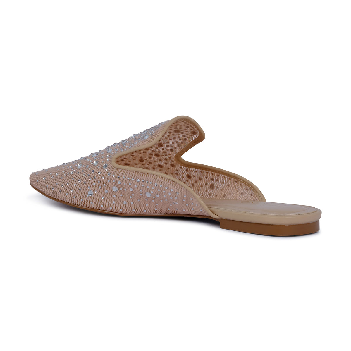 Chic slip-on mules in a nude tone, adorned with sparkling crystal embellishments. Designed with a sleek pointed toe and flat sole for effortless style and comfort.