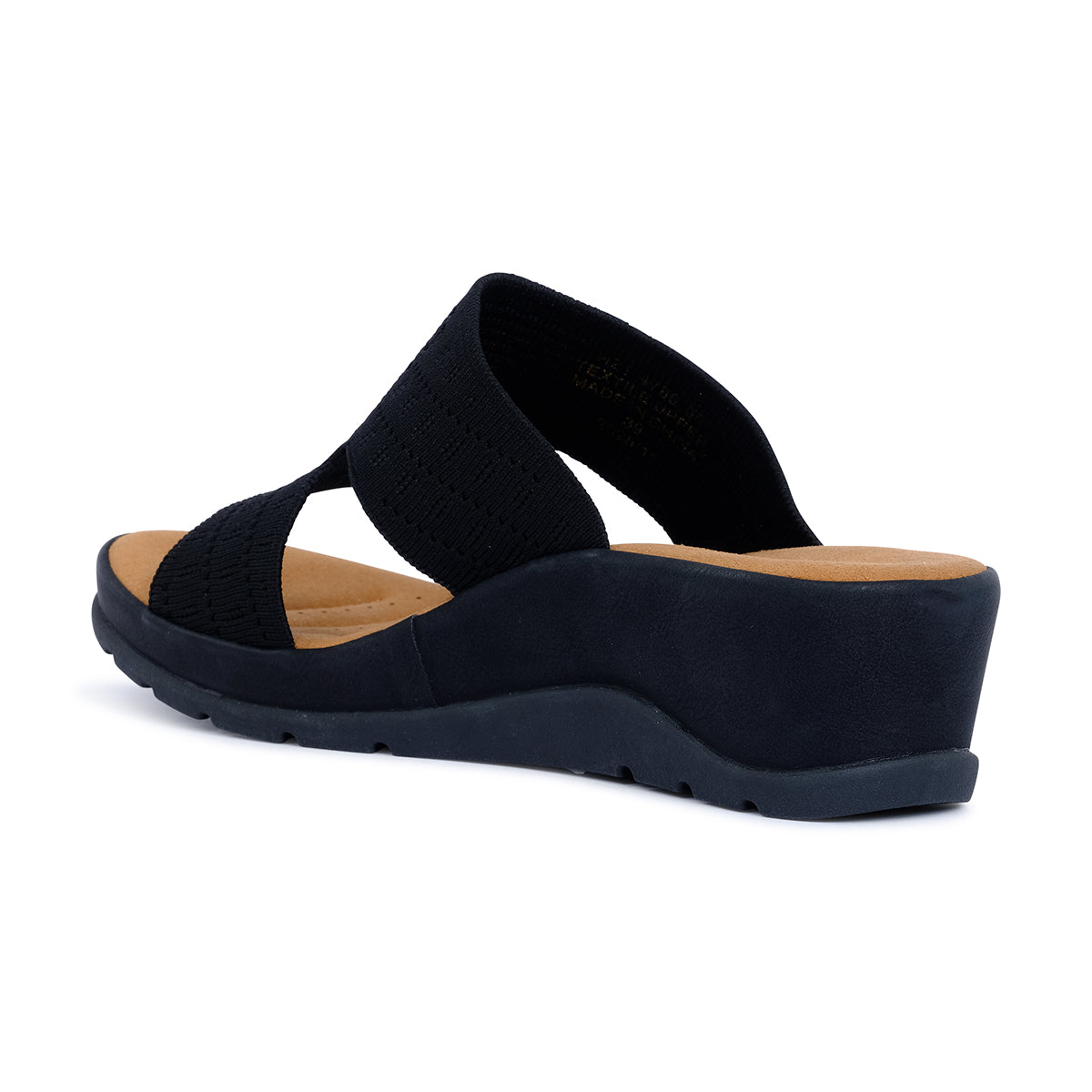 Contemporary black wedge slide with cutout knit straps and cushioned footbed. Lightweight design combines comfort and modern style for effortless everyday wear.