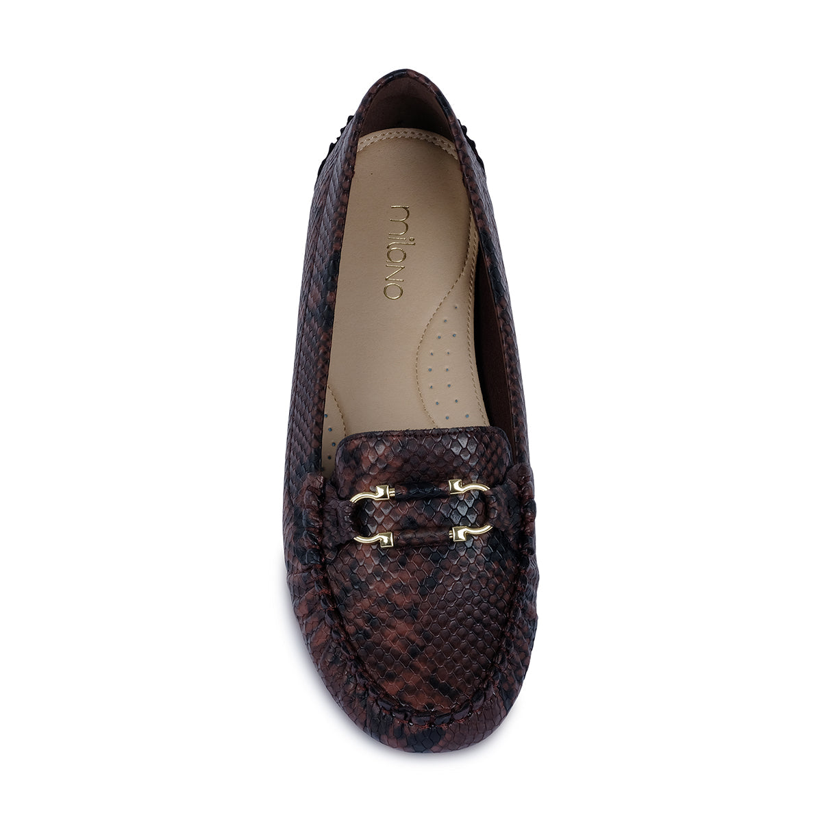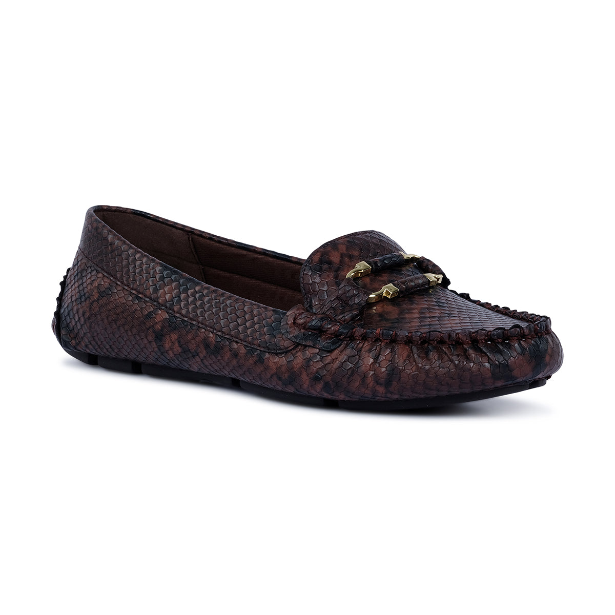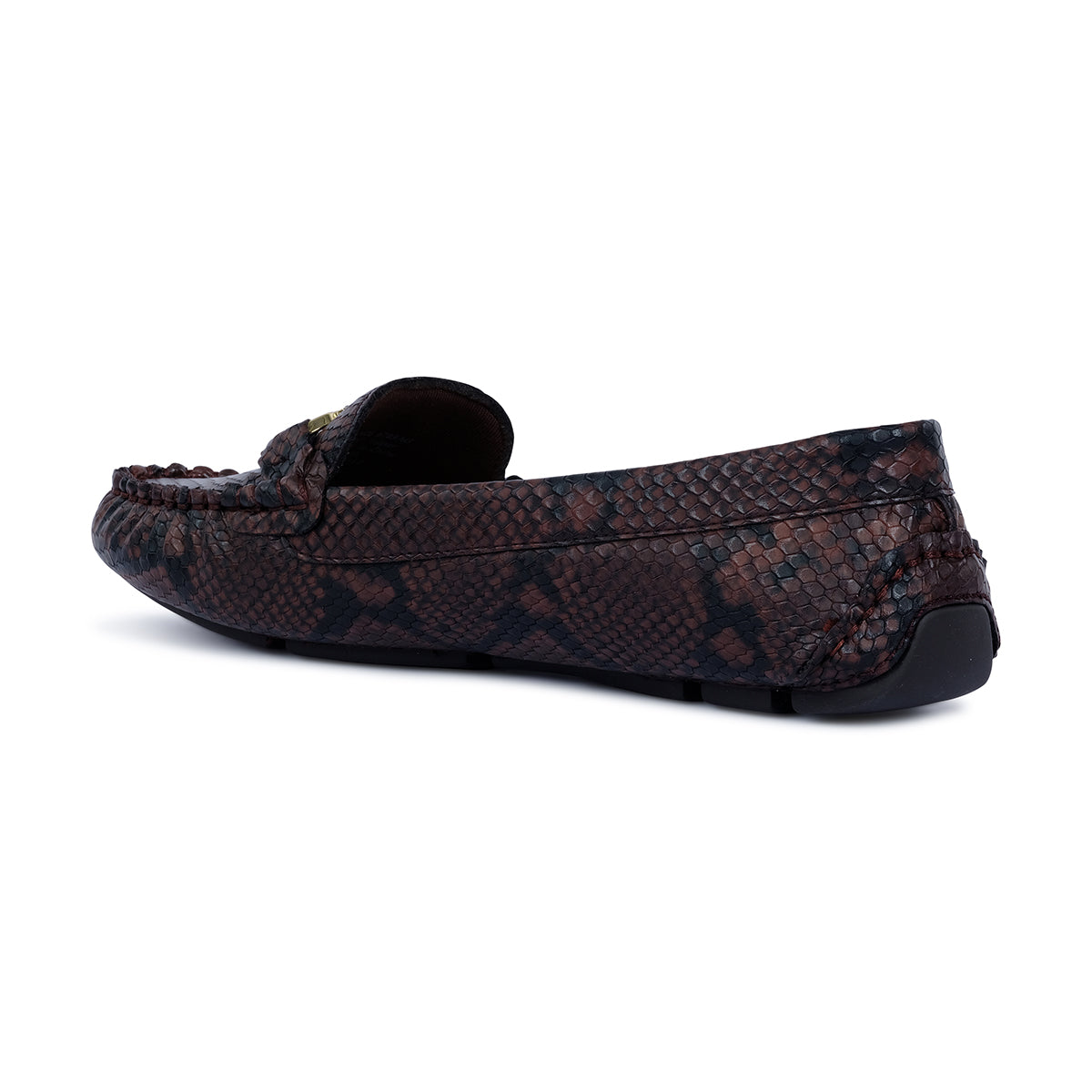 Luxurious brown moccasin with a subtle snakeskin texture, featuring a classic moc toe and refined gold-tone hardware. A chic blend of timeless design and modern sophistication.
