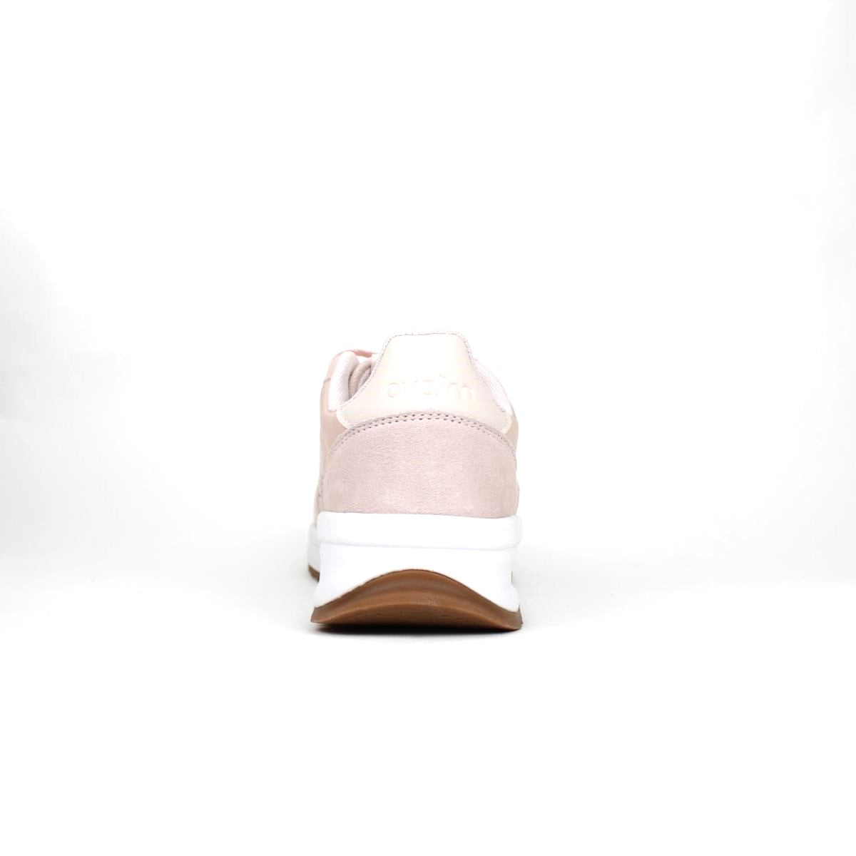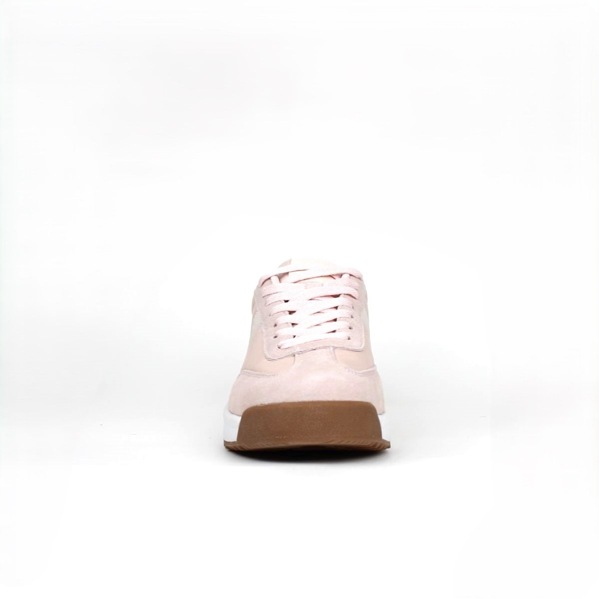 These chic and sporty light pink sneakers feature a soft suede and textile upper, a chunky white platform sole, and a durable gum outsole. The subtle branding and tonal laces complete the clean, minimalist design.