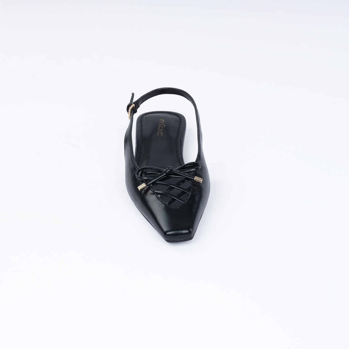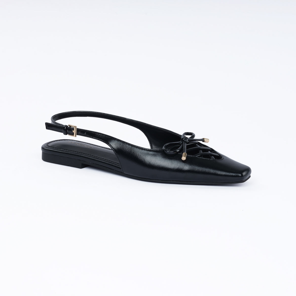 These Tabea flats feature a corset-inspired upper design with a chiseled toe and a small bow detail, offering a blend of classic elegance and modern style. The adjustable buckle strap ensures a secure and comfortable fit
