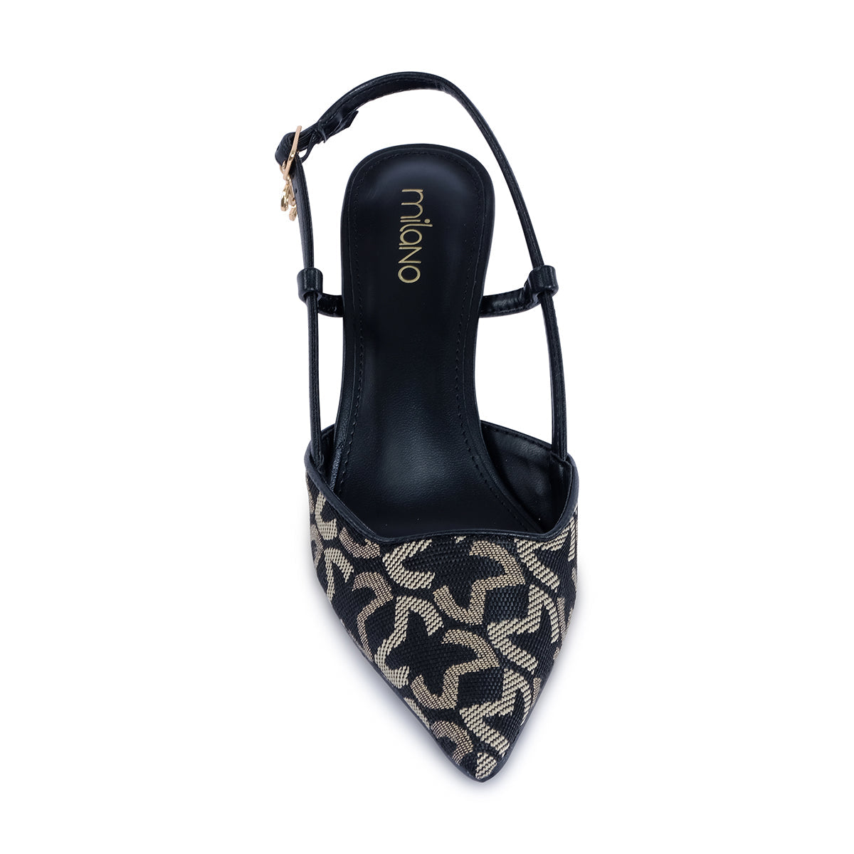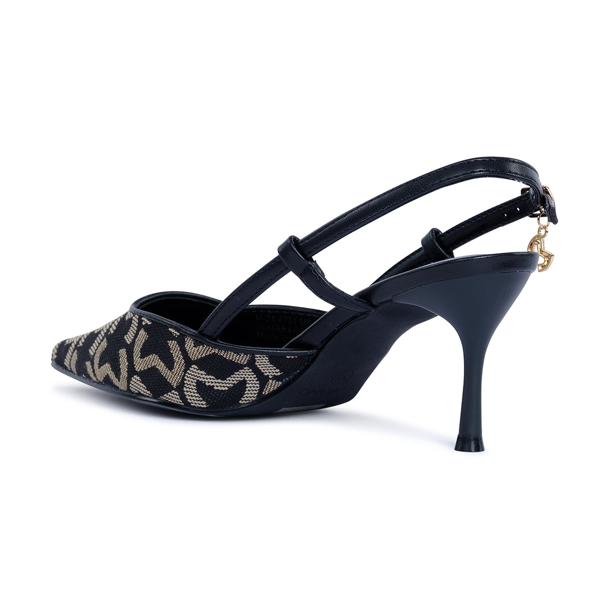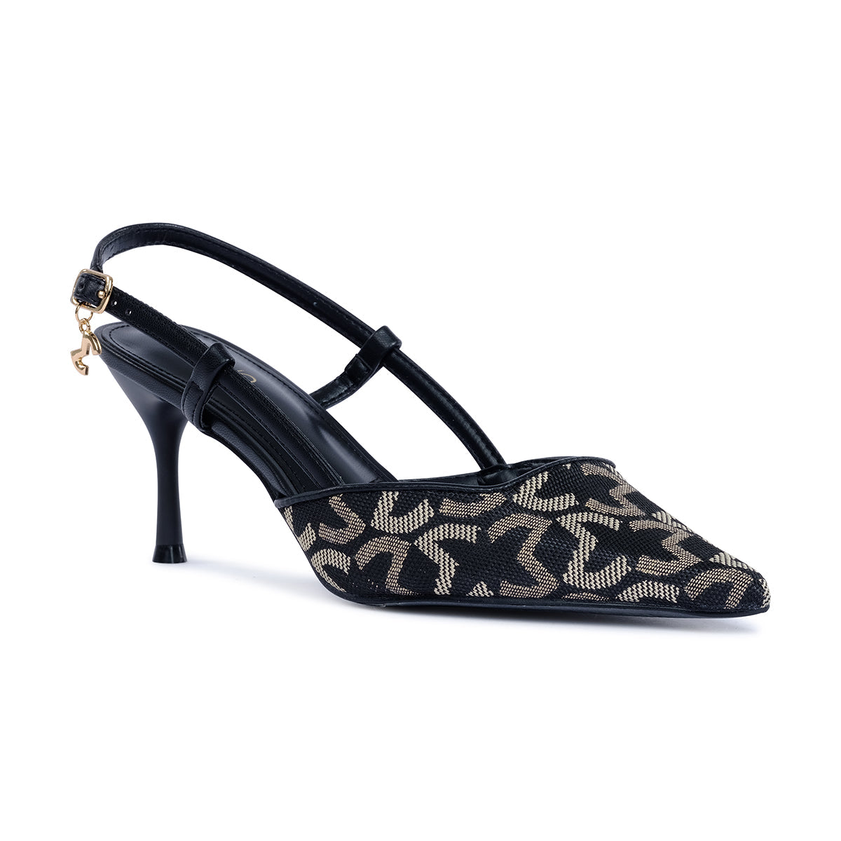 Statement black slingback pumps with a sharp pointed toe and slim stiletto heel. Features an intricate monogram pattern, bold buckle detail, and a polished gold-tone accent for a luxe finish.