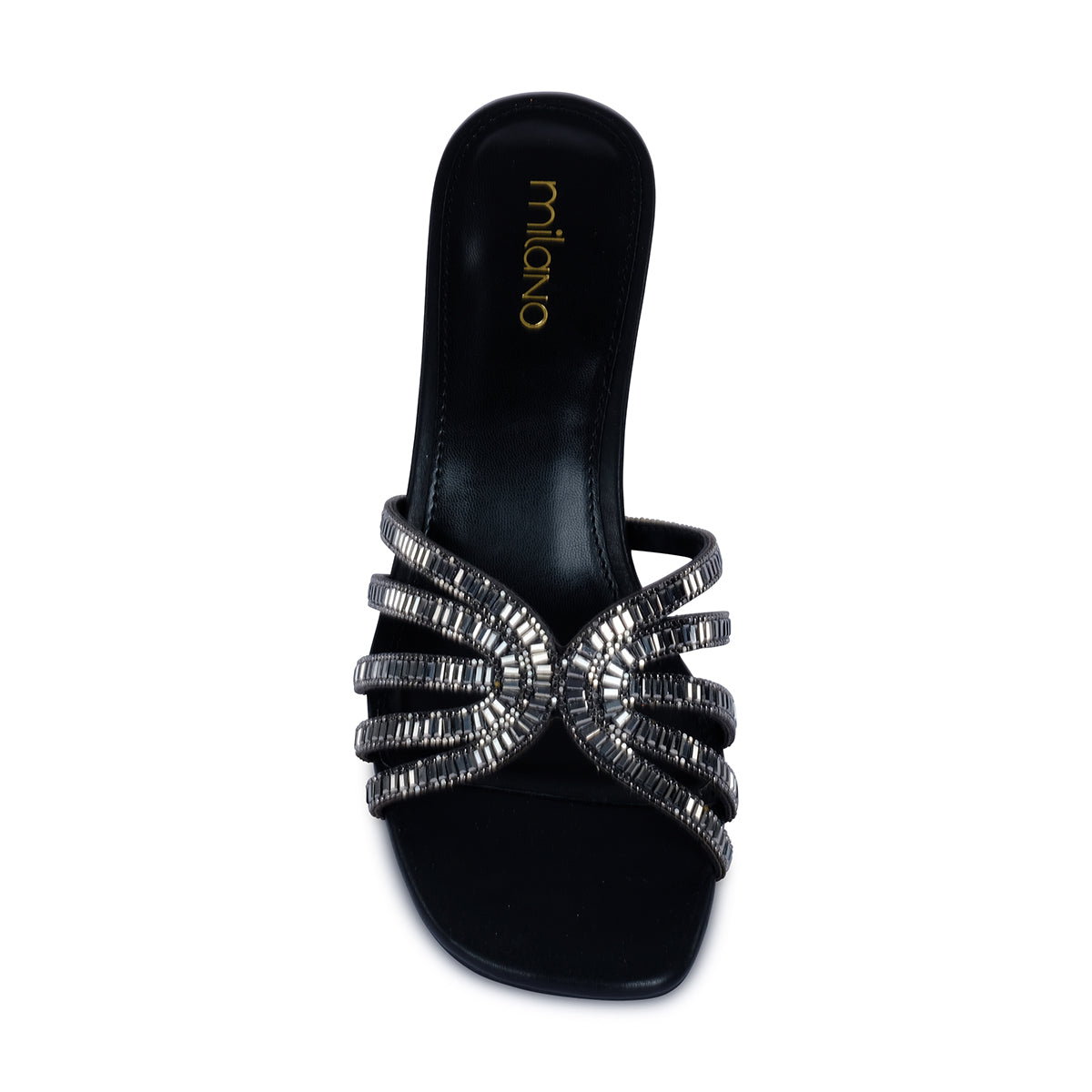 Stylish black heeled sandal featuring an open-toe design with multiple slim straps embellished with sparkling rhinestones. Set on a sleek mid-height heel for an elegant look, perfect for evening events or special occasions.