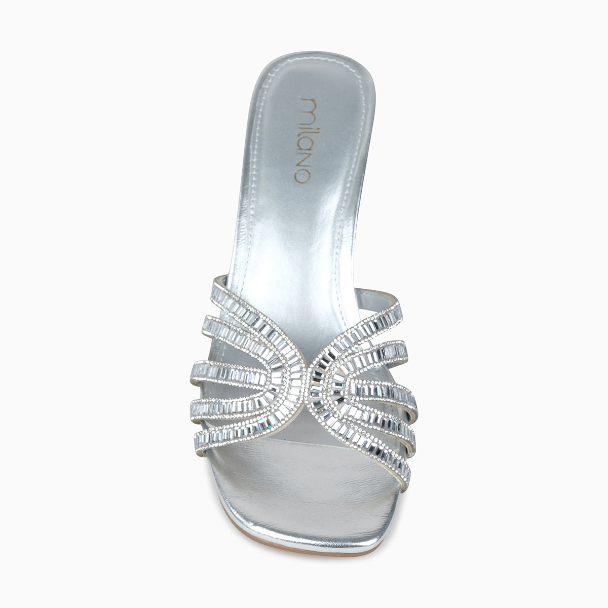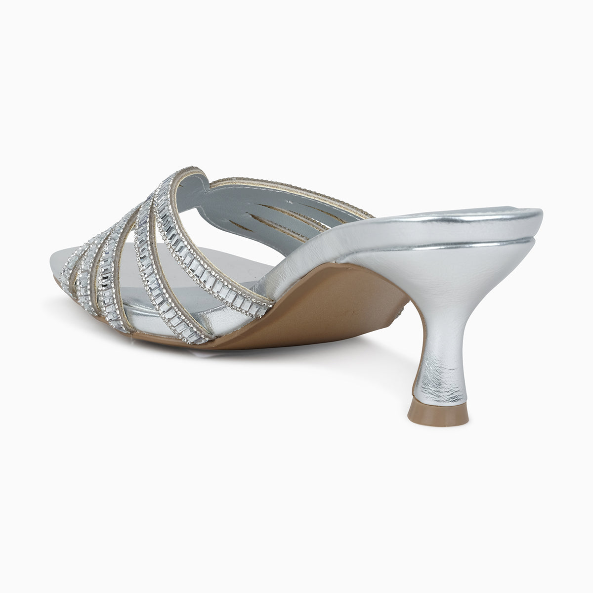 Stylish silver heeled sandal featuring an open-toe design with multiple slim straps embellished with sparkling rhinestones. Set on a sleek mid-height heel for an elegant look, perfect for evening events or special occasions.
