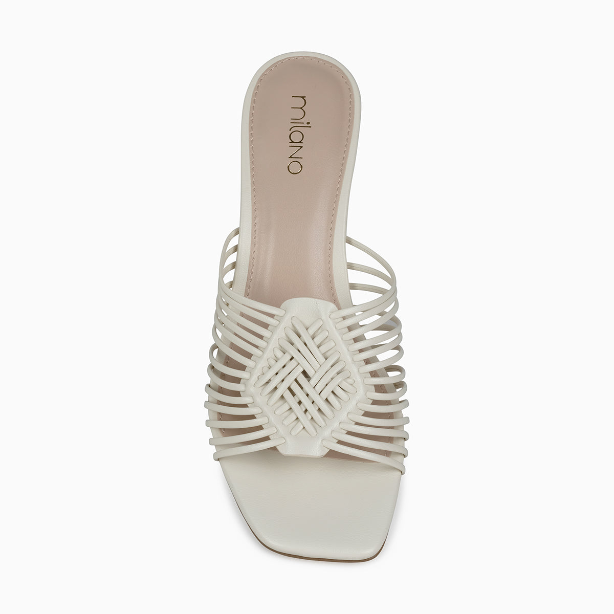 Chic cream heeled mule featuring an open-toe design with intricate woven straps and a square toe finish. Set on a slim mid-height heel for an elegant silhouette, perfect for summer outings or evening occasions.