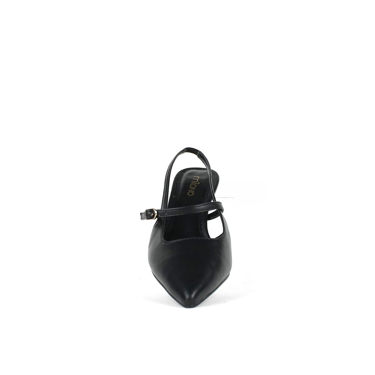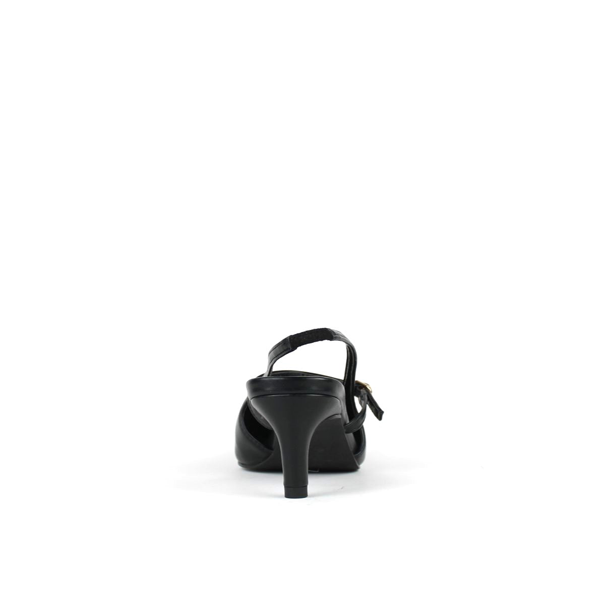 Elegant black slingback pumps, a sophisticated choice for any occasion. These shoes feature a sleek pointed toe and a stylish flared block heel. A delicate strap with a polished buckle crosses the foot, providing both a secure fit and a refined accent. The adjustable slingback strap ensures a comfortable and customizable fit.